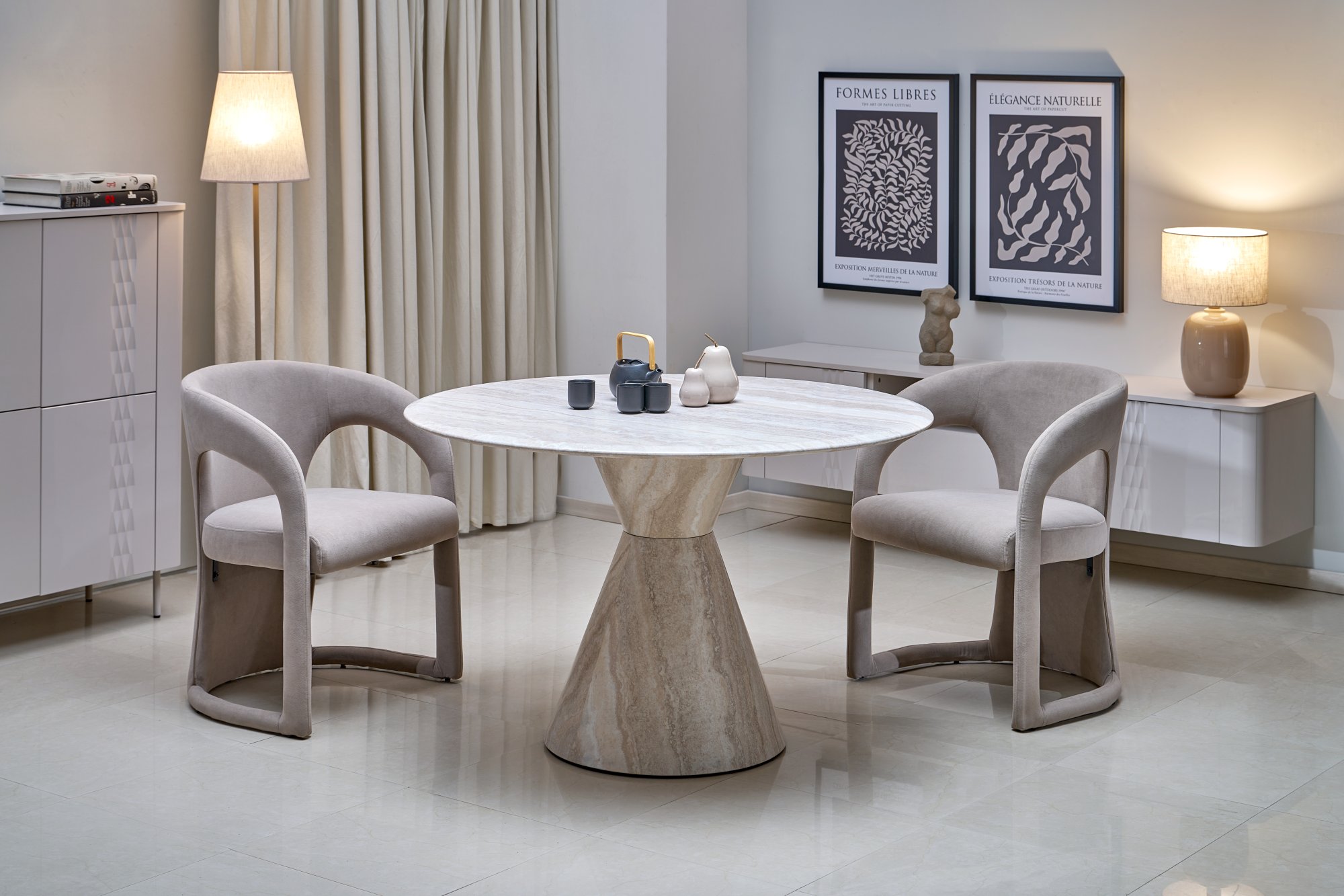 wymiary: 120/77 cm, materiał: MDF okleinowany, kolor: blat – jasny trawertyn, noga – jasny trawertyn