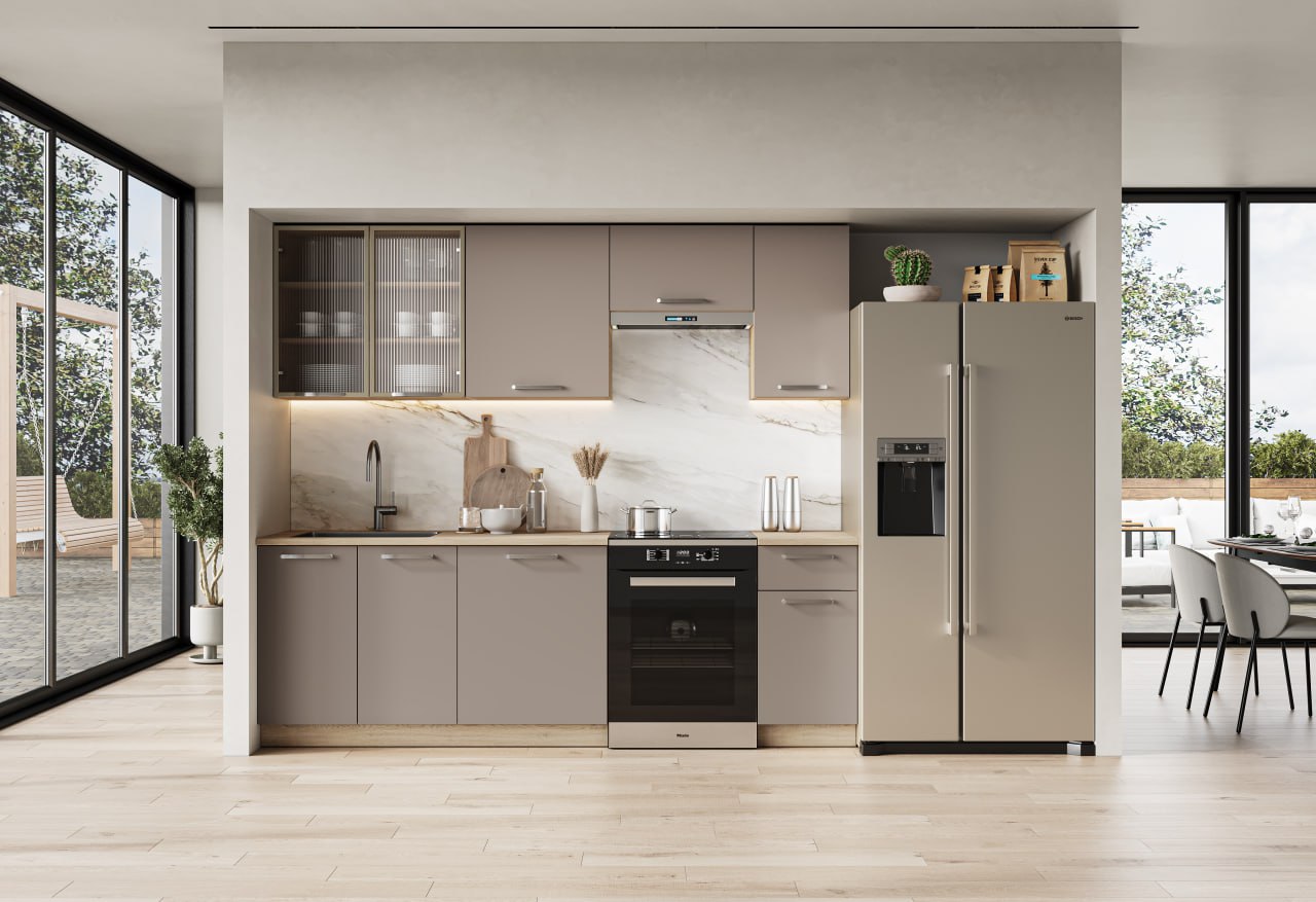 długość zestawu: 240 cm, podnośniki gazowe, regulacja szafek górnych, i stopek szafek dolnych, wysokie szafki górne, aluminiowe ramki, szkło, blat grubości 28 mm, kolory: fronty – beżowy, korpus – dąb cremona, blat – dąb cremona
