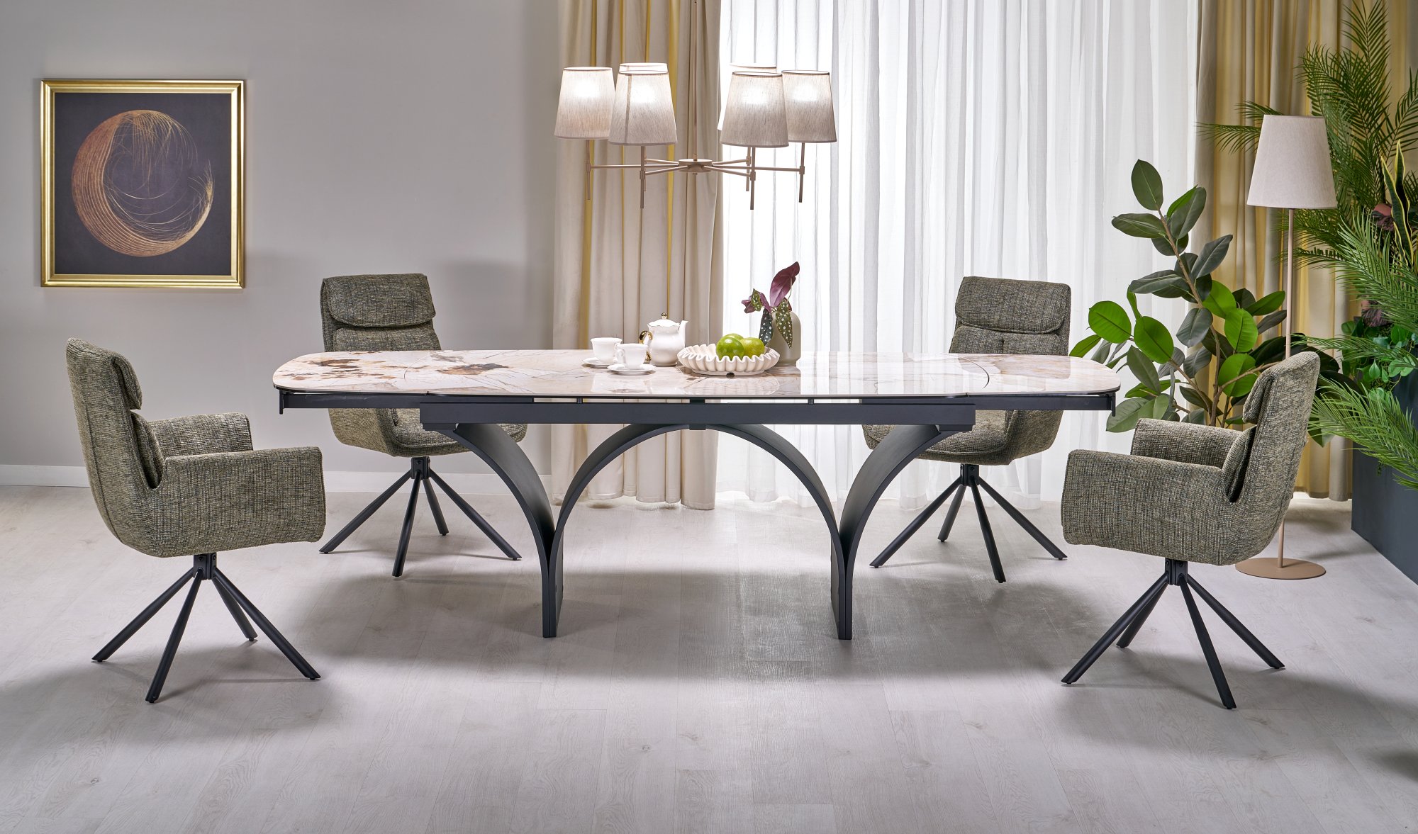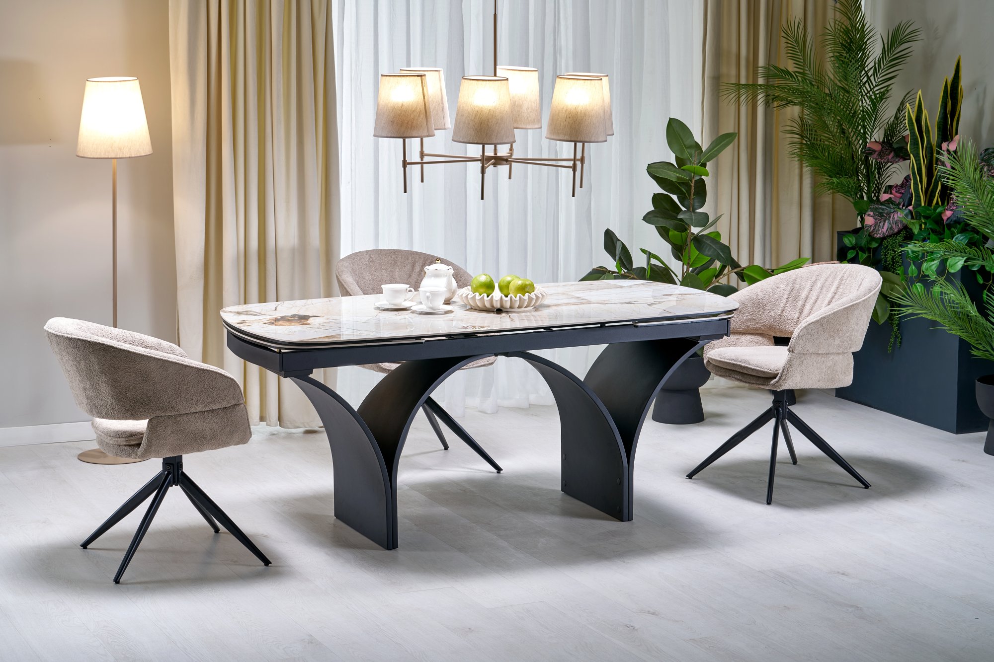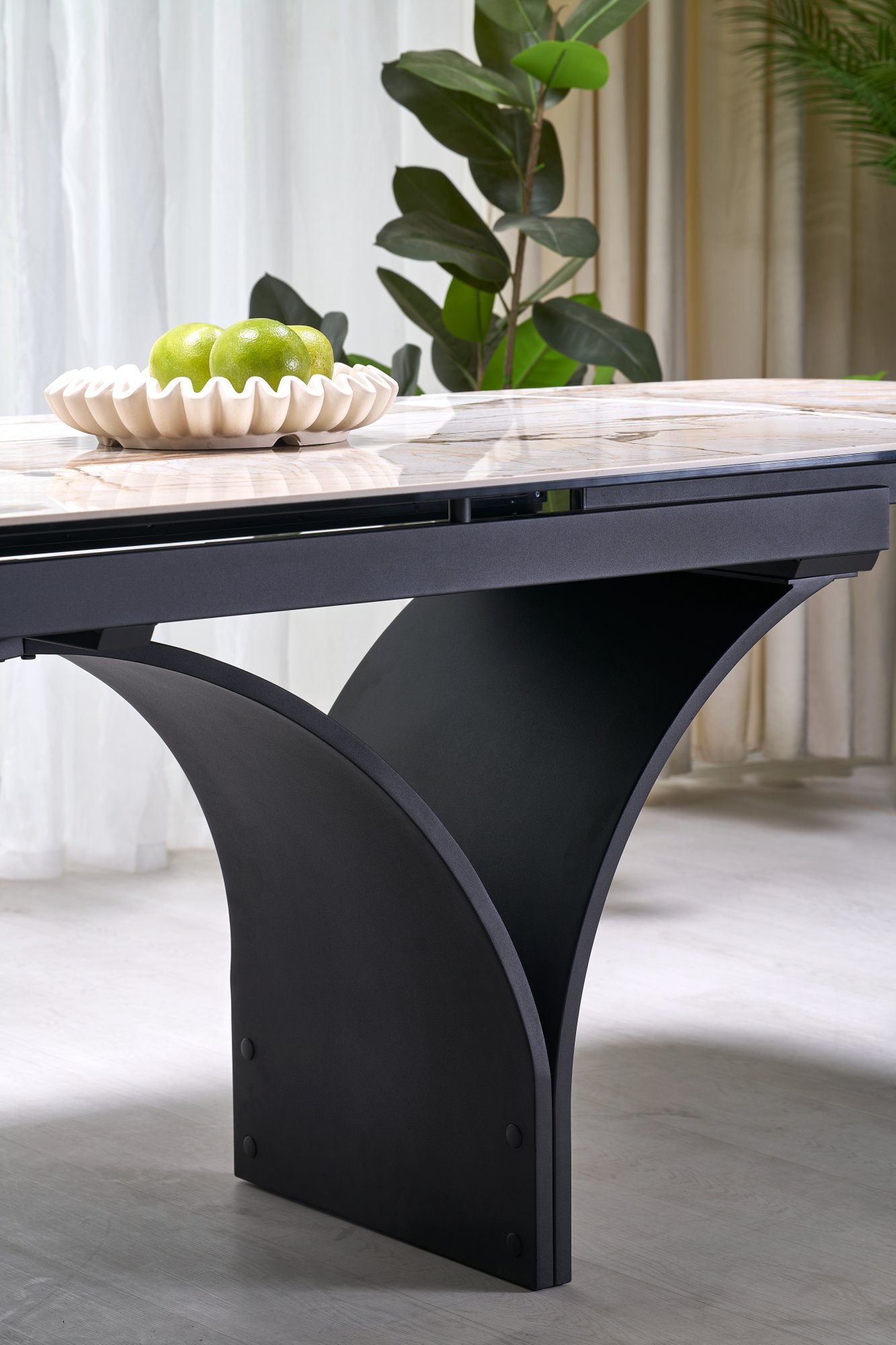 wymiary: 180-260/90/74 cm, stół rozkładany, materiał: ceramika / szkło / stal malowana proszkowo, kolor: blat – beżowy marmur, noga – czarny
