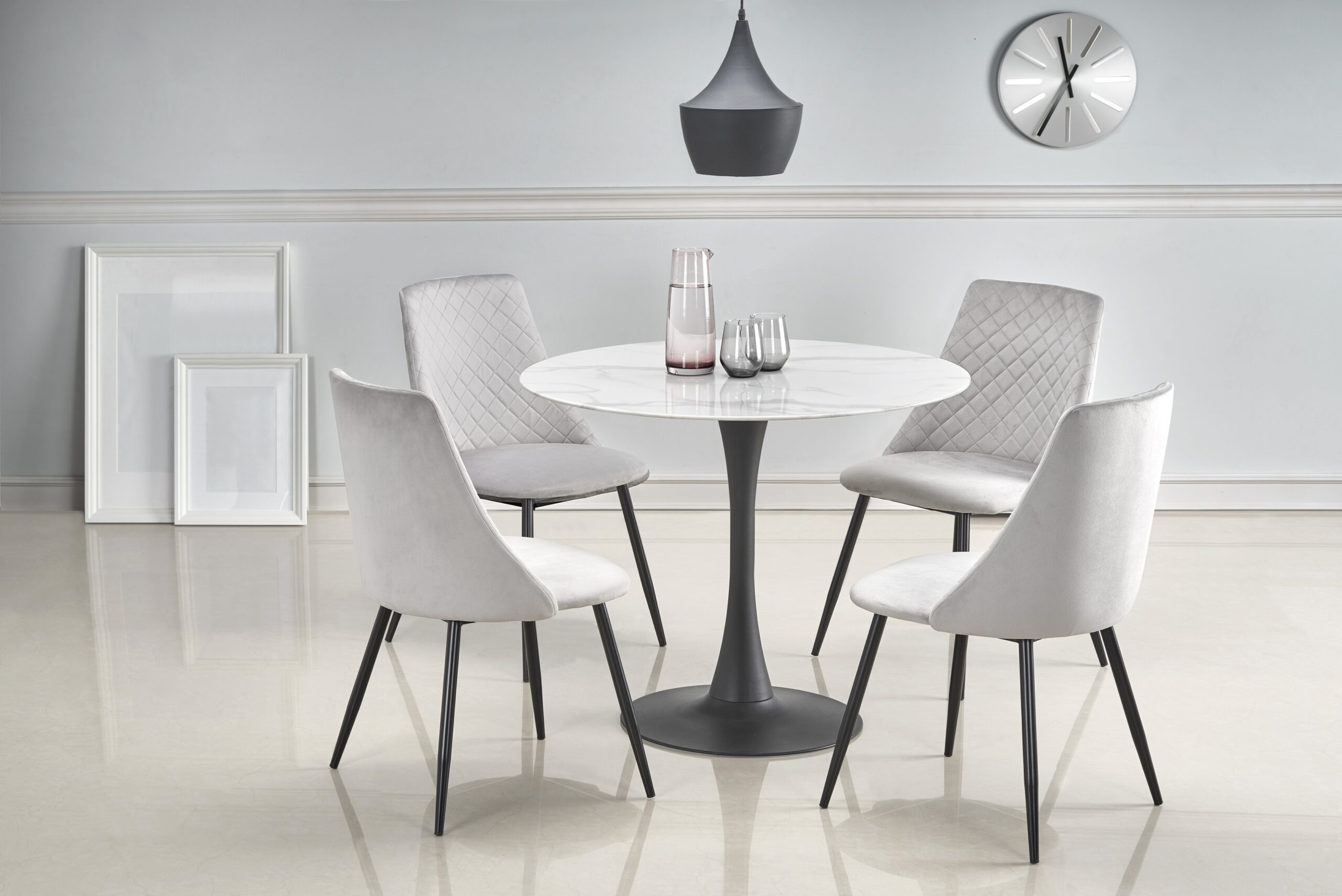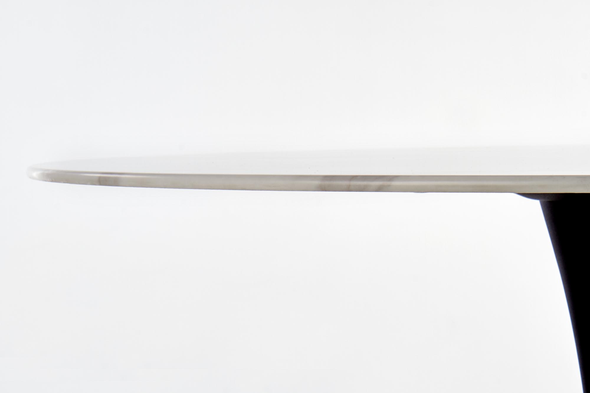 wymiary: o90/72 cm, materiał: szkło / stal malowana proszkowo, kolor: blat – biały marmur, nogi – czarny
