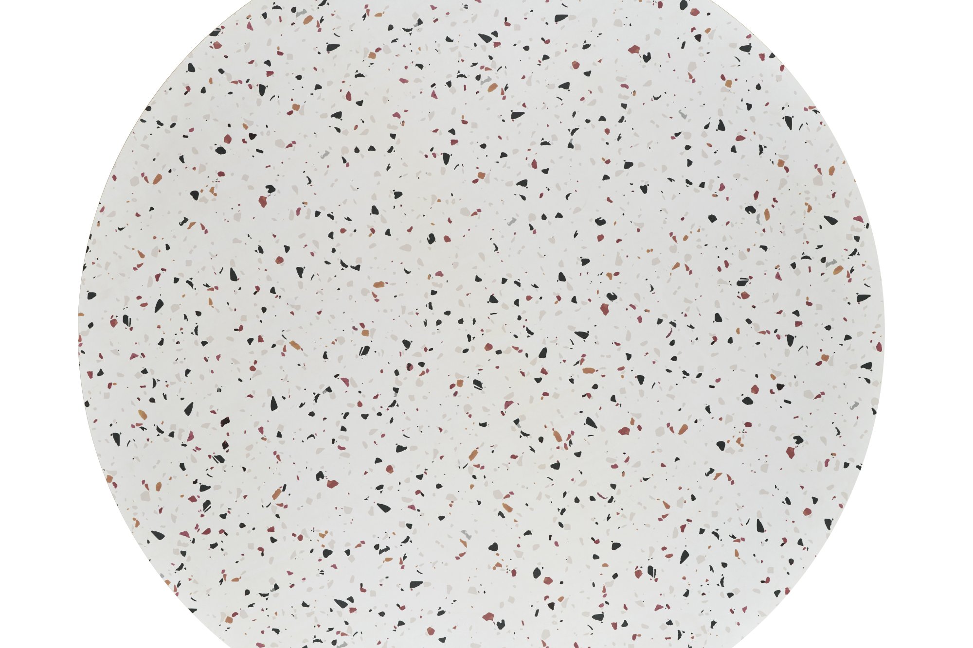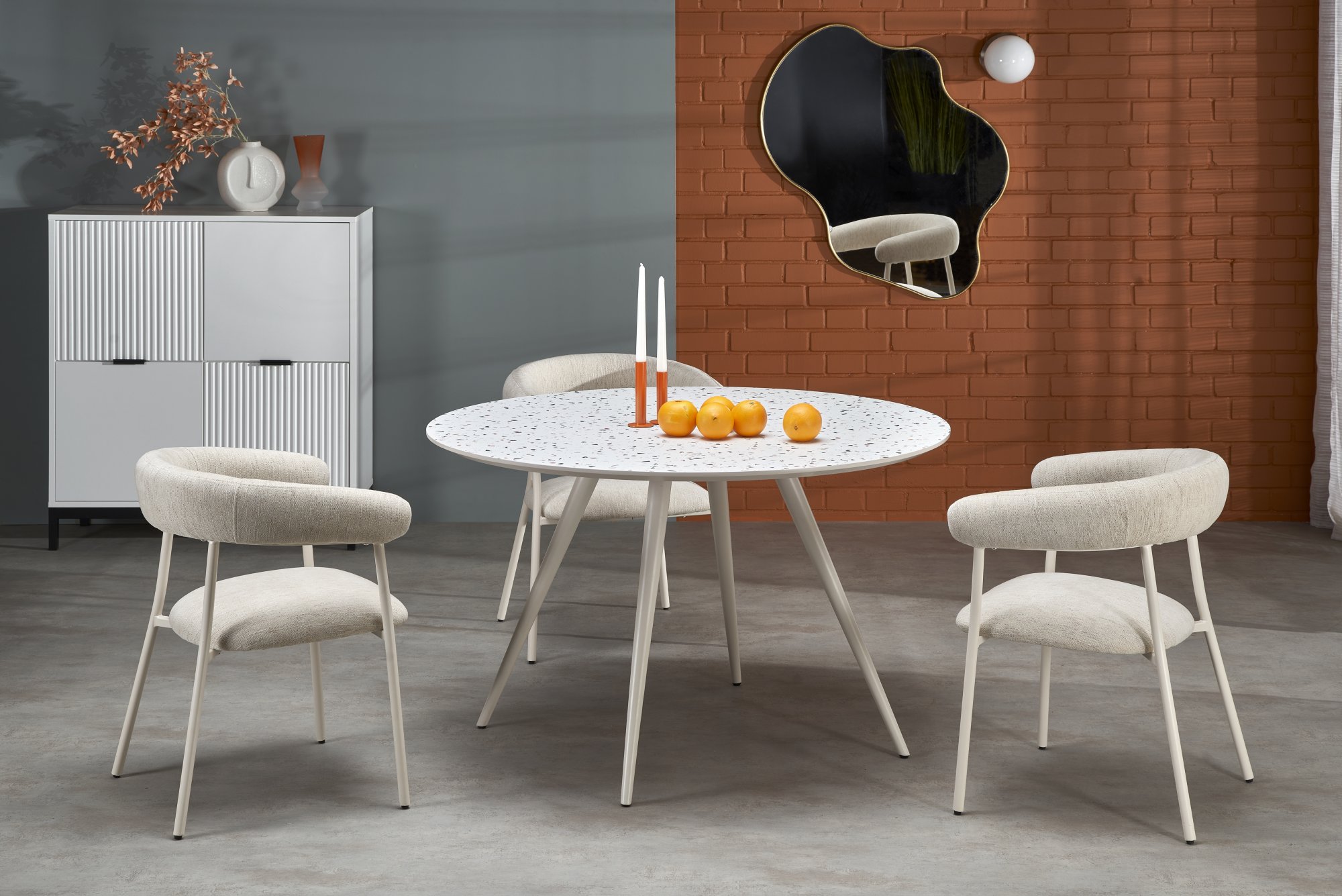 wymiary: 120/76/68 cm – rozstaw nóg; materiał: MDF + płyta HPL / stal malowana proszkowo, kolor: blat – lastryko, nogi – biały