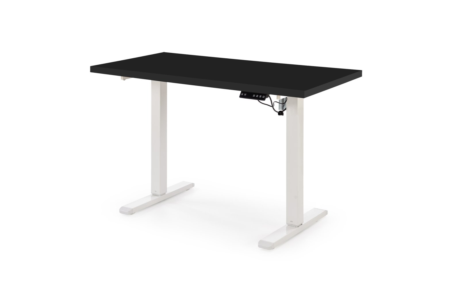 wymiary: 120/60/75-120 cm, biurko z funkcją regulacji wysokości, materiał: płyta meblowa laminowana / stal malowana proszkow, kolory: blat – czarny, stelaż – biały
