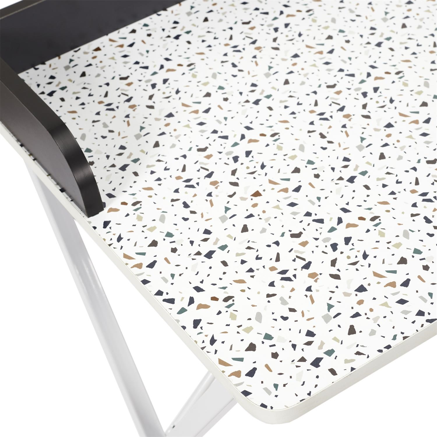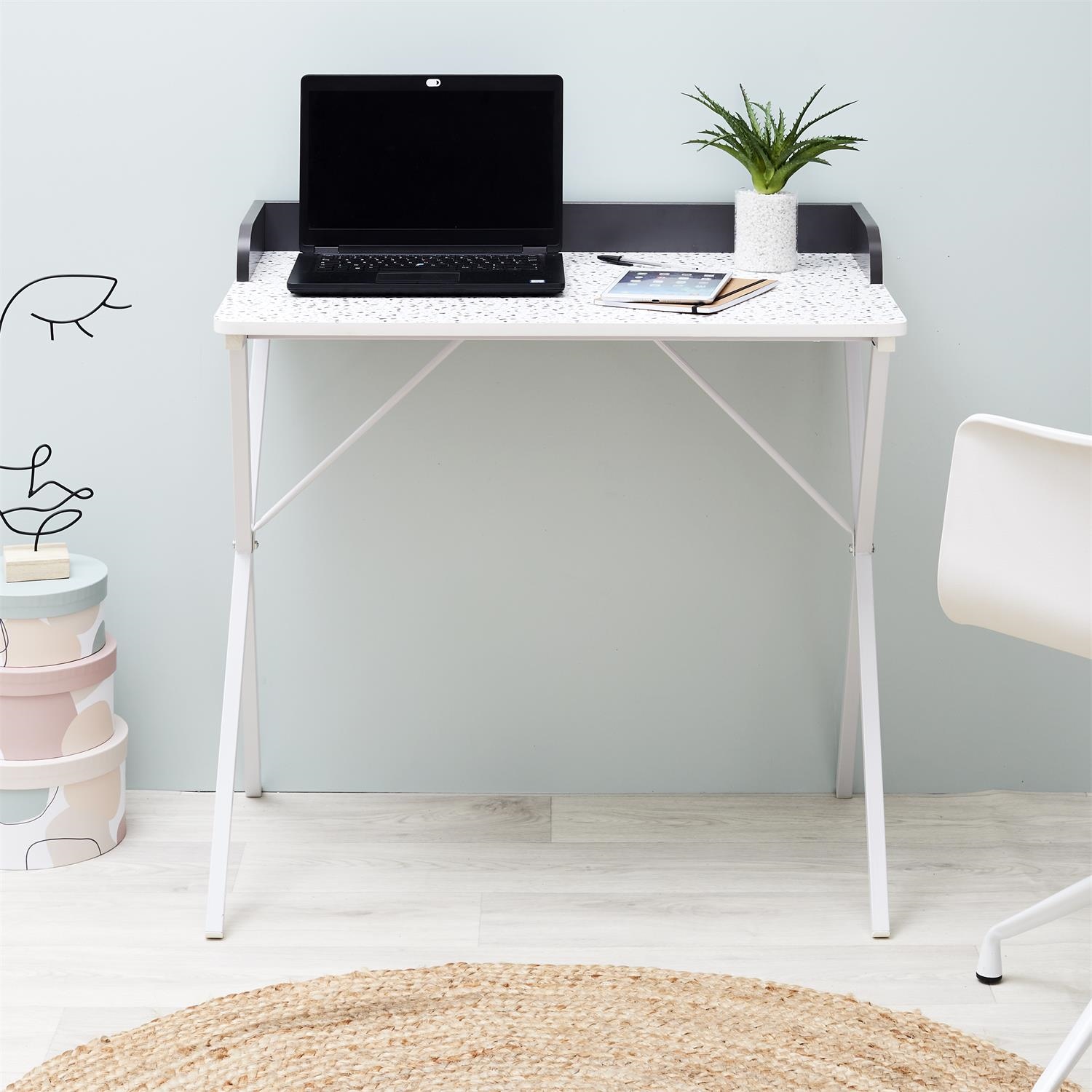 Pracuj z uśmiechem przy biurku Brice we wzór lastryko. Jego elegancki, nowoczesny design z charakterystycznym wzorem lastryko dodaje stylu i świeżości każdemu wnętrzu. Solidna konstrukcja i przestronny blat zapewniają wygodę i funkcjonalność, idealnie komponując się w biurze, domowym gabinecie lub przestrzeni roboczej. Długość produktu: 84,4 cm Wysokość produktu: 50 cm Głębokość produktu: 80 cm Materiał blatu: Drewno – MDF Materiał nóg: Metal – żelazo