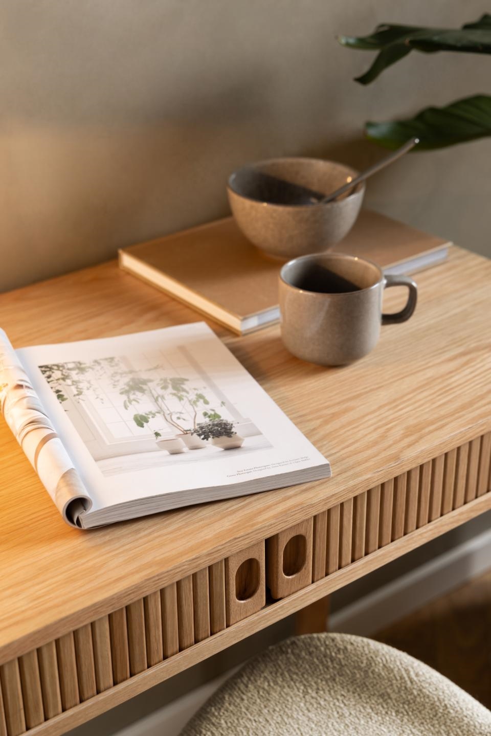 Wykonane w prostokątnej formie z zaokrąglonymi rogami, biurko łączy w sobie nowoczesną i naturalną estetykę, która pasuje do najnowszych stylów wnętrz. Listwy dekoracyjne, okrągły kształt i lakierowane dębowe akcenty definiują charakterystyczny wygląd biurka. Wewnątrz biurka, za drzwiczkami z lamelami, można przechowywać niezbędne przedmioty. Biurko z dekoracyjną listwą uwydatniającą teksturę . Prostokątny korpus z fornirem dębowym i zaokrąglonymi narożnikami . Zaprojektowane z drzwiami żaluzjowymi. Lakierowane wykończenie zapewnia naturalne wrażenie . Prostokątne biurko Langley, blat MDF wykończny fornirem dębowym lakierowanym, 2 drzwi MFDF fornir dębowy lakierowany NC, podstawa dębowa lakierowana NC, z frontem lamelowym, drzwiami przesuwnymi i drzwiami żaluzjowymi, 100x50x75 cm