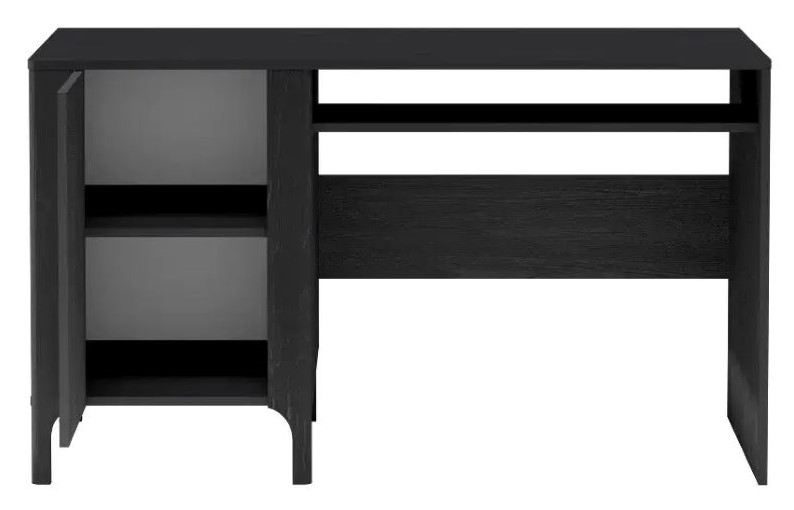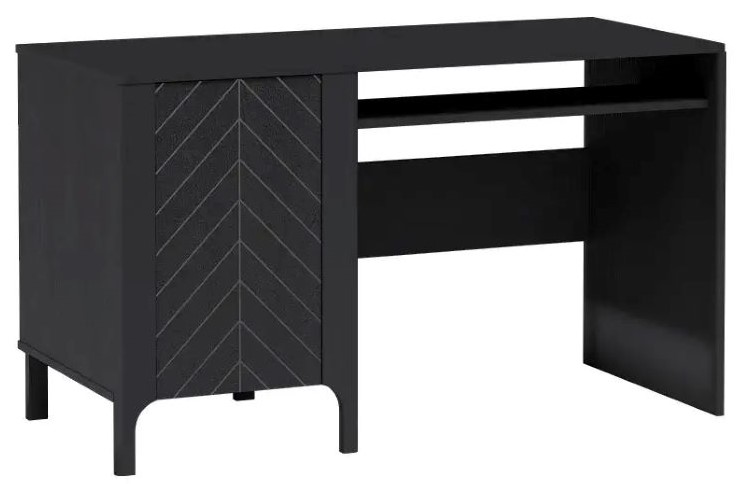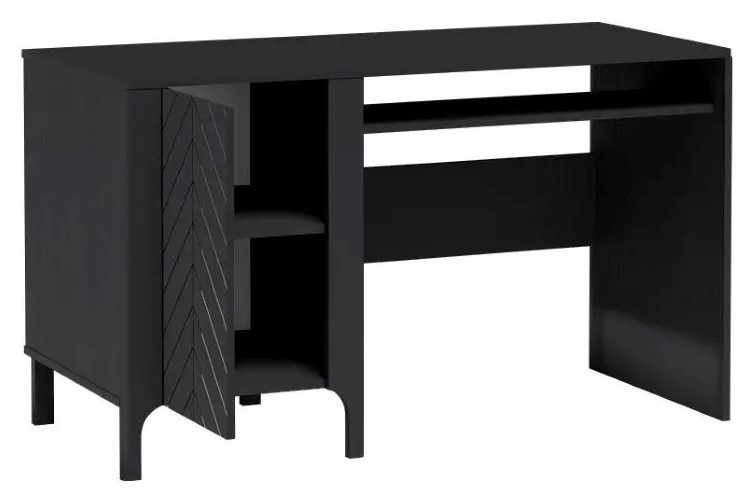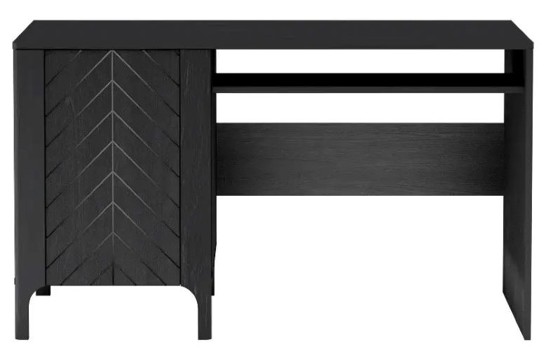 To eleganckie biurko o minimalistycznym designie zostało zaprojektowane z myślą o nowoczesnych przestrzeniach biurowych i domowych. Wykonane z wysokiej jakości materiałów, łączy w sobie funkcjonalność oraz stylowy wygląd. Wbudowana szafka z drzwiami – idealna do przechowywania dokumentów, książek czy innych przedmiotów biurowych. Drzwi ozdobione wzorem w jodełkę dodają elegancji i nowoczesnego charakteru. Jedna pojemna półka – umieszczona za drzwiczkami, umożliwiaja wygodne zorganizowanie przestrzeni. Wykonana z trwałego materiału, gwarantuje stabilność i długą żywotność. Głęboka czerń pasuje do wielu aranżacji wnętrz, podkreślając nowoczesny design.
