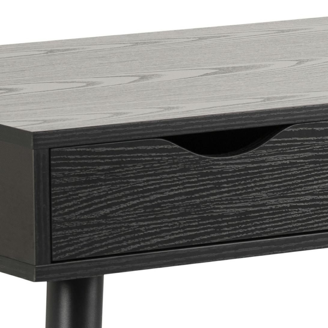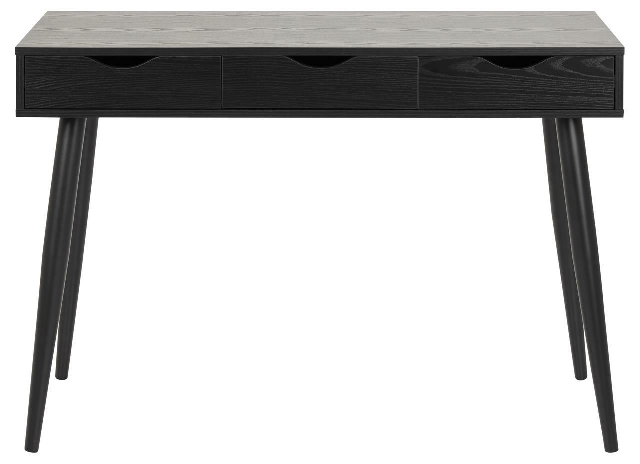 Nowoczesne biurko Scandi będzie idealnym meblem do pracy w domu lub do odrabiania lekcji. Biurko wykonane zostało z bardzo wytrzymałej czarnej płyty melaminowej oraz metalowych nóg malowanych proszkowo na biało. Matowe wykończenie biurka dodaje mu klasycznego wyglądu. Biurko posiada 3 szuflady, które ułatwią przechowywanie. Delikatne wyprofilowane uchwyty w szufladzie są poręczne i dodają meblowi delikatnego skandynawskiego wyglądu. Biurko o szerokości 110 cm sprawdzi się nie tylko w dużym biurze czy pokoju nastolatka, ale również doskonale będzie wyglądać w mniejszych pomieszczeniach lub kąciku biurowym. Wymiary kartonów : 8x 122,5 x 67cm, 13,5 x 73x 23cm