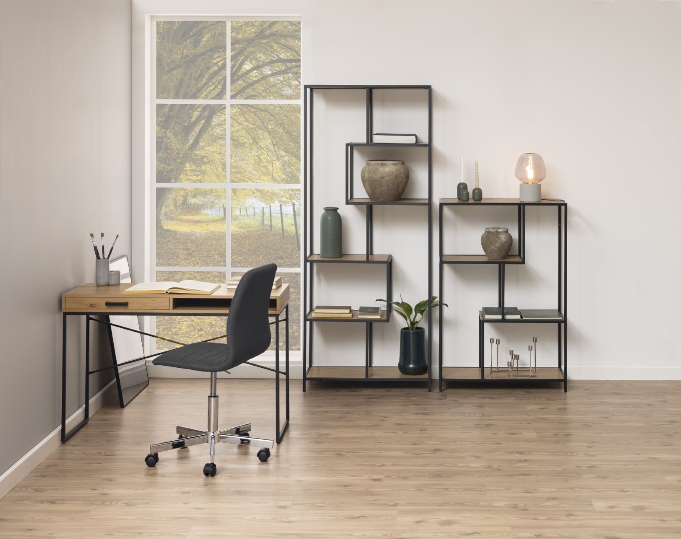 Biurko Seaford z szufladą to mebel w stylu minimalistycznym idealny do pokoju młodzieżowego lub domowego biura. Jego podstawa wykonana jest z malowanego proszkowo metalu w kolorze czarnym. Blat stanowi płyta MDF w okleinie dębowej. Ten model biurka posiada pod blatem szufladę z metalowym uchwytem, a także dodatkowy schowek. Cechą charakterystyczną są dwa krzyżujące się metalowe elementy z tyłu biurka. Biurko Seaford z szufladą sprawdzi się świetnie przy odrabianiu lekcji, pracy przy komputerze czy wypełnianiu dokumentów. Ilosć kartonów: 1 Wymiary kartonów: 150,5×65,5x15cm Waga kartonów: 31,1kg