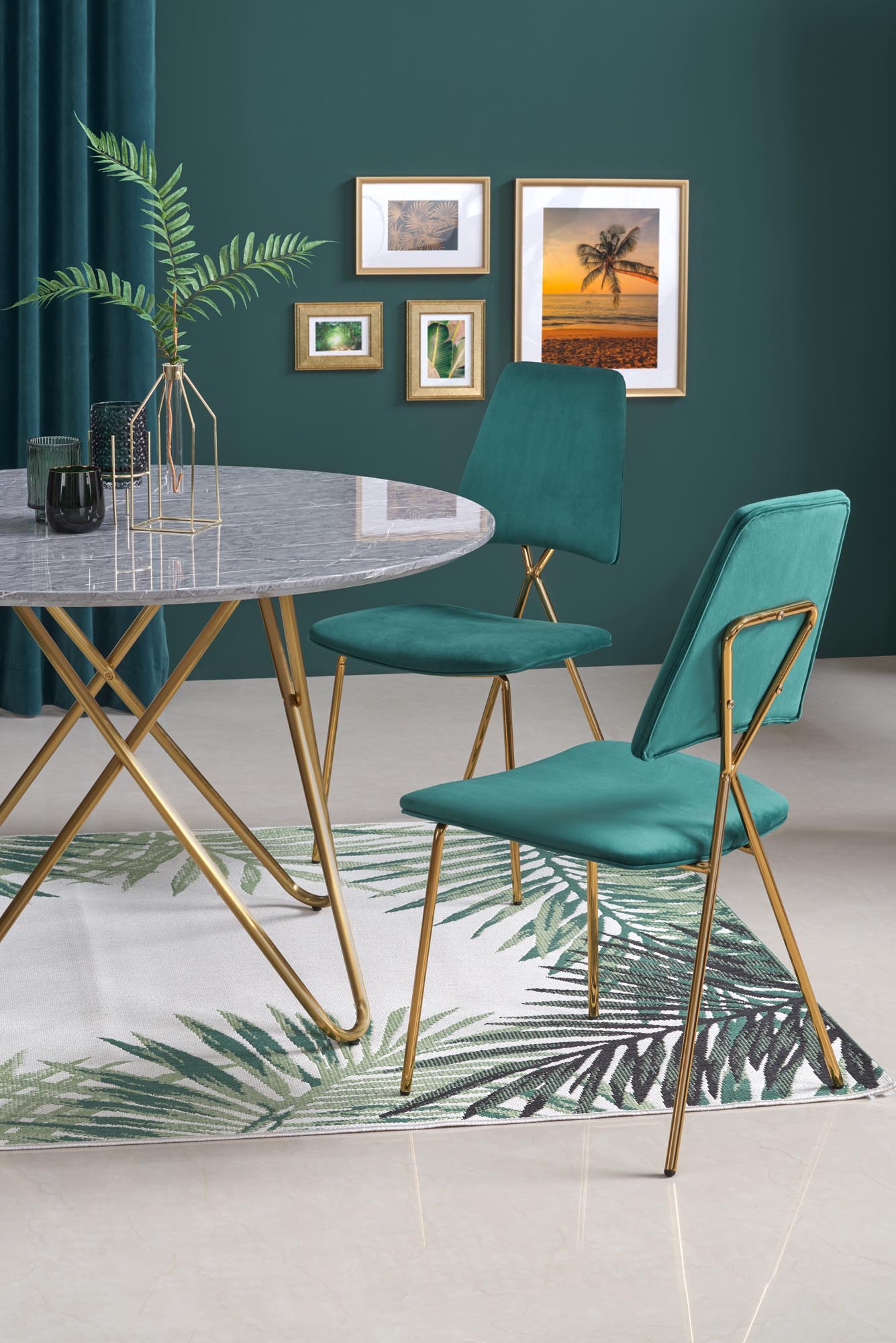 wymiary: o120/76 cm, materiał: MDF okleinowany / stal chromowana, kolor: blat – popielaty marmur, nogi – złoty