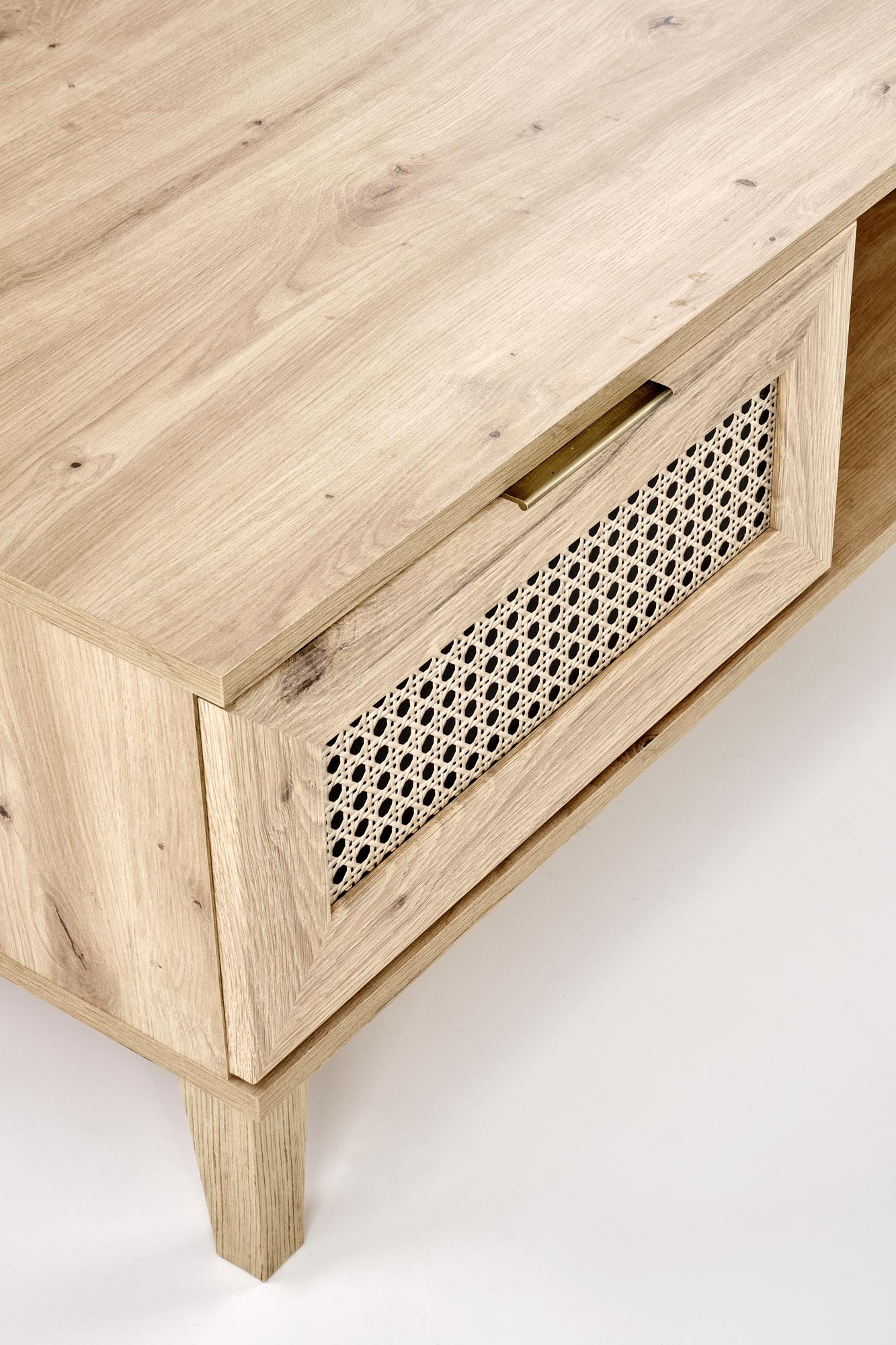 ława, wymiary: 120/60/41 cm, materiał: płyta meblowa laminowana / MDF laminowany / płyta HDF laminowana / polipropylen, kolor: dąb artisan – naturalny Uwaga: wzór plecionki jest nadrukowany