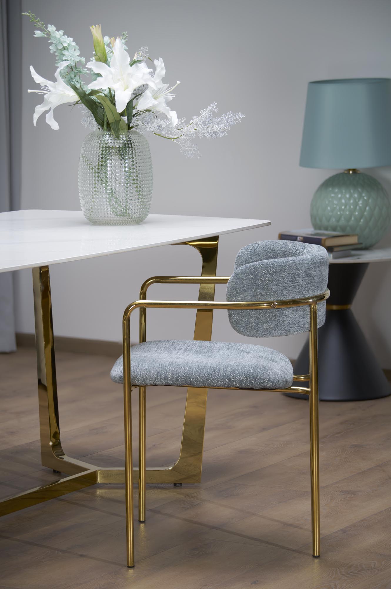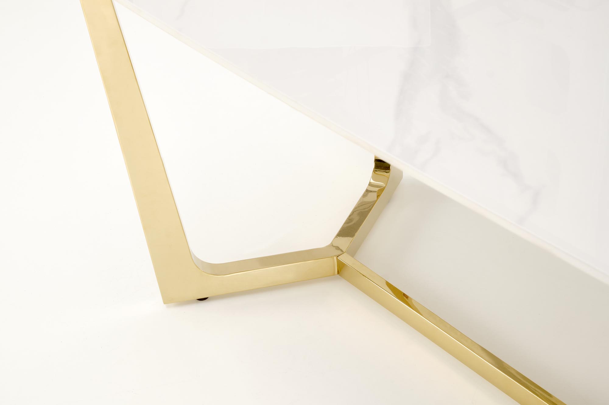 wymiary: 160/90/76/120 cm; materiał: spiek / stal nierdzewna, kolor: blat – biały marmur, nogi – złoty