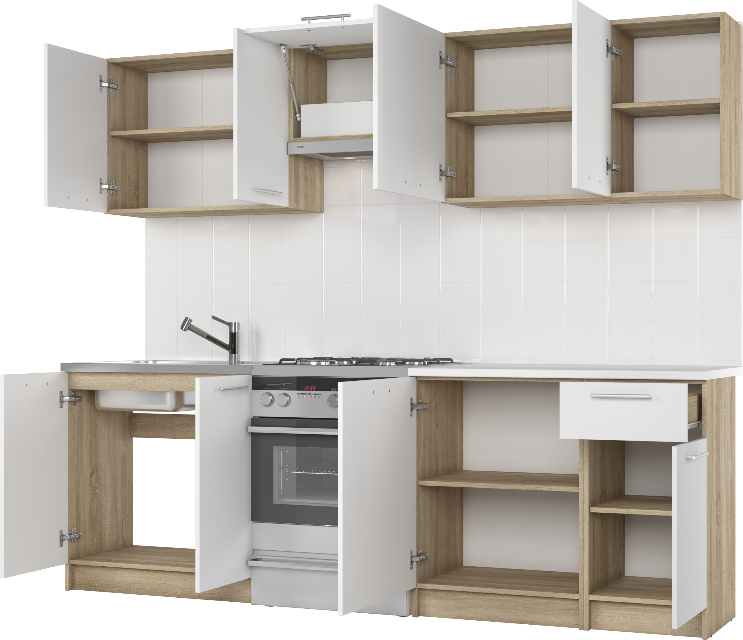 długość zestawu: 240 cm, podnośniki gazowe, grubość blatu: 28 mm, kolory: front – biały, korpus – dąb sonoma, blat – biały