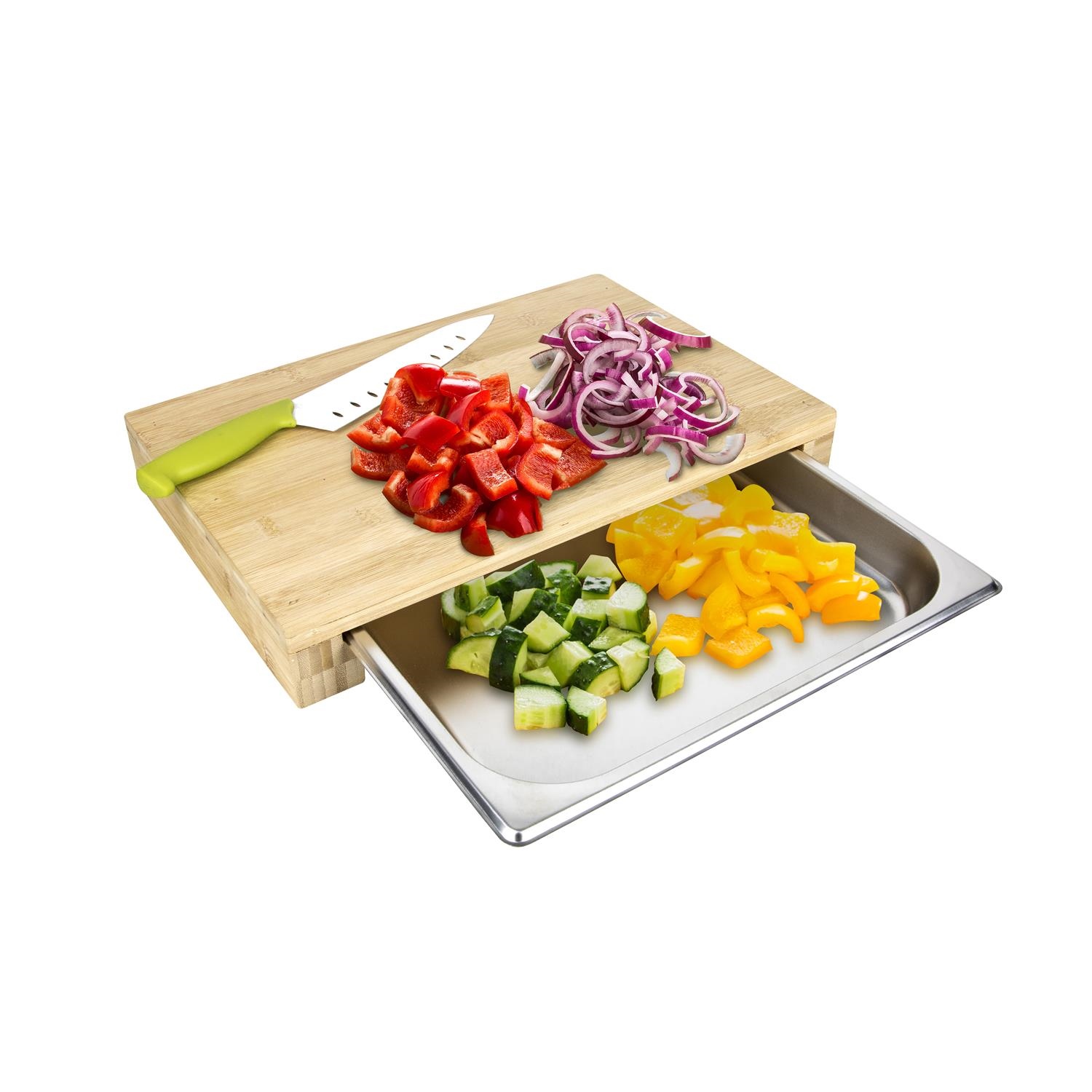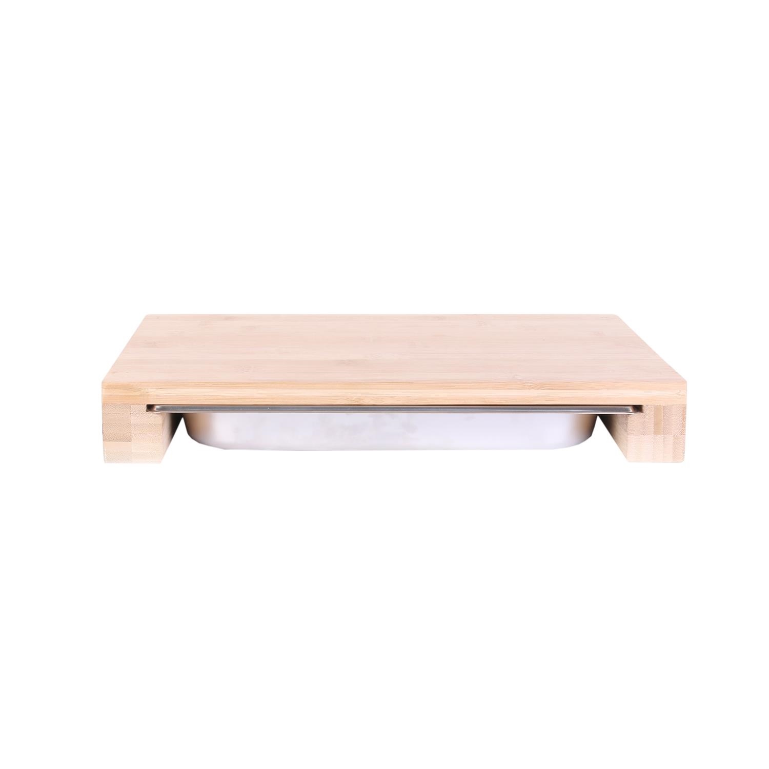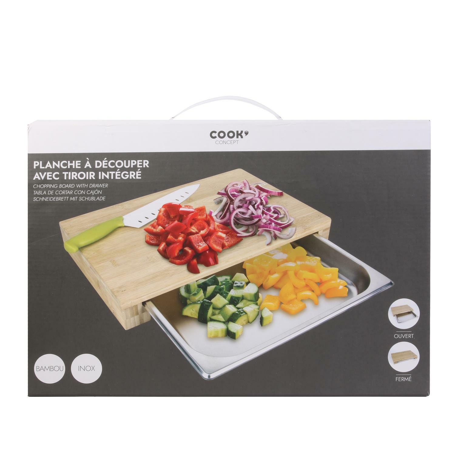 Deska do krojenia z szufladą to bardzo wygodne, ergonomiczne połączenie. Pozwala zachować porządek podczas pracy w kuchni i ograniczyć ilość używanych naczyń. Deska wykonana jest z bambusa, zaś sama szuflada ze stali nierdzewnej. Ilość kartonów: 1 Wymiary kartonów: 39,4×32,4×6,5cm