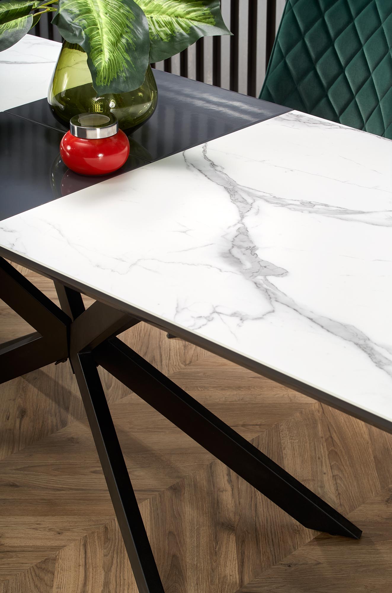 stół rozkładany, wymiary: 160-200/90/76 cm, materiał: ceramika / MDF lakierowany / stal malowana proszkowo, kolor: blat – biały marmur / ciemny popiel, nogi – czarny