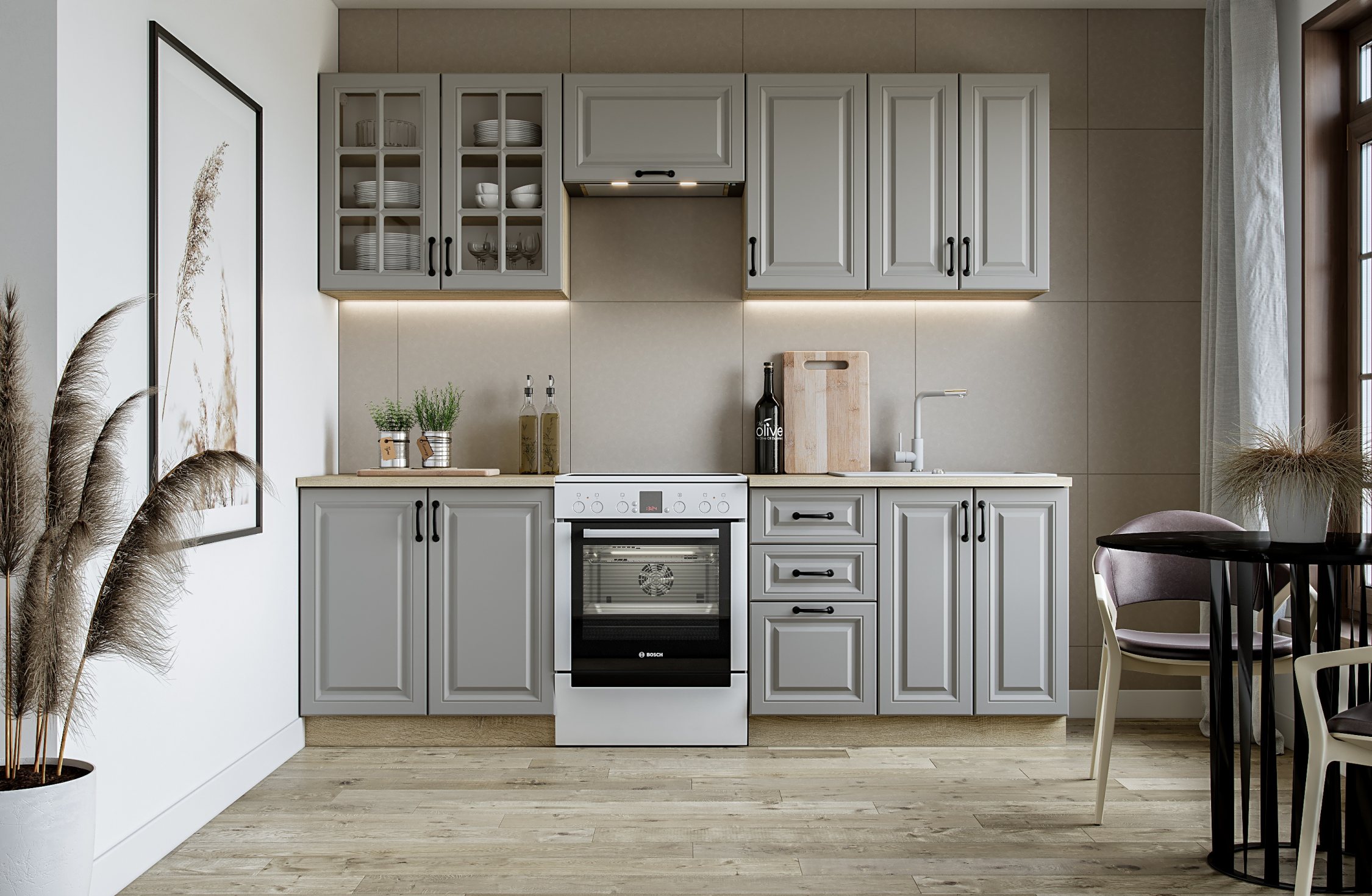 Długość zestawu: 240 cm, podnośniki gazowe, blat grubości 28 mm, fronty MDF kolory: front – popielaty, korpus – dąb sonoma, blat: dąb sonoma