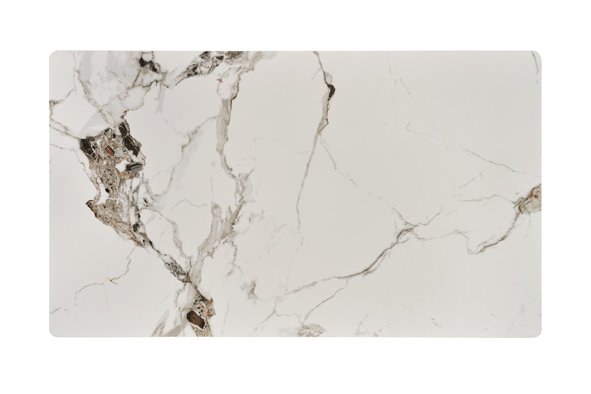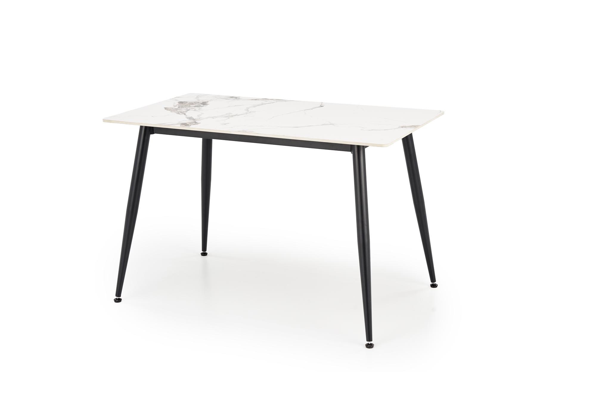 wymiary: 120/70/76/100 cm; materiał: spiek / stal malowana proszkowo, kolor: blat – biały marmur, nogi – czarny