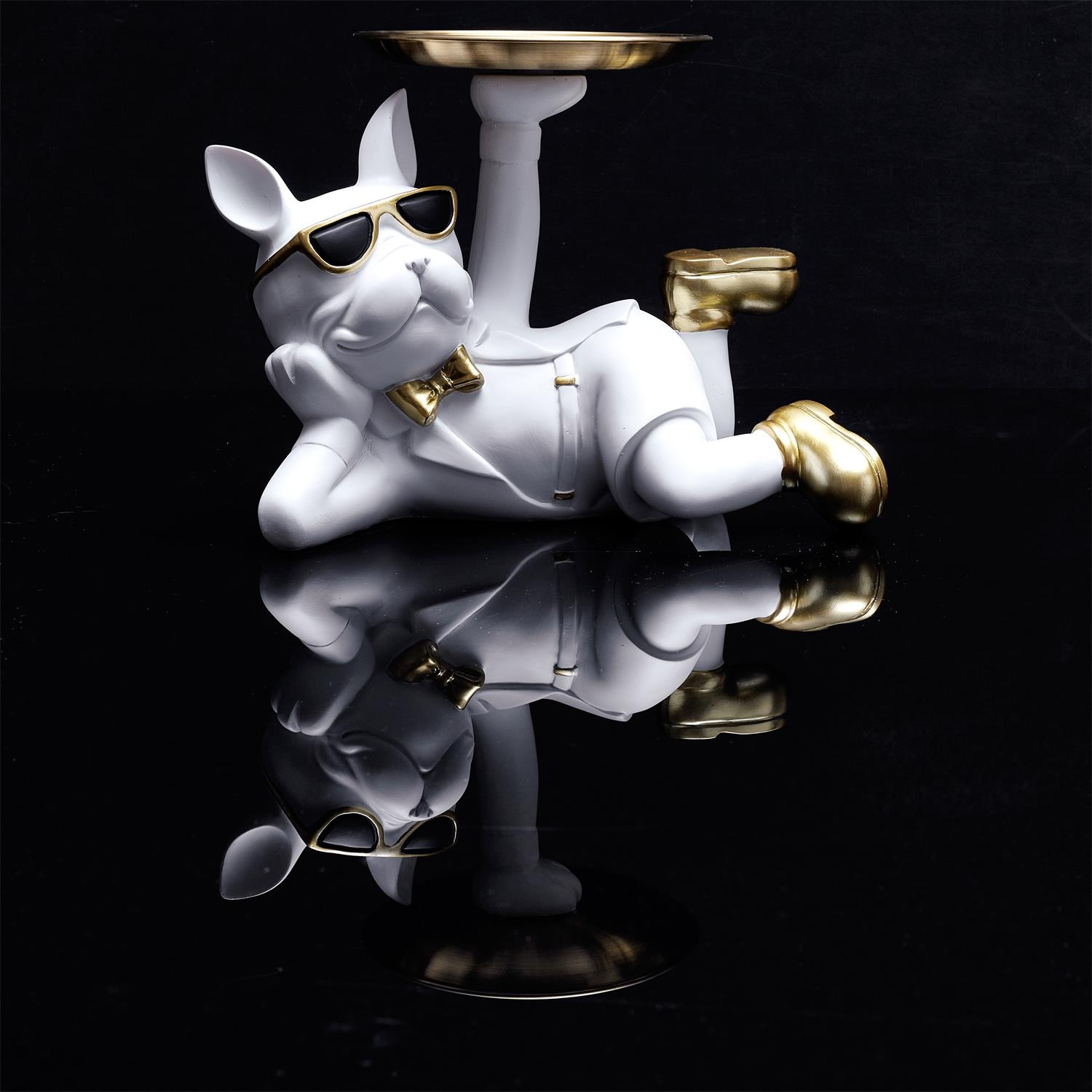Dodaj odrobinę elegancji i uroku do swojego wnętrza dzięki tej urokliwej figurce buldoga. Wykonana w białym kolorze, przedstawia buldoga w leżącej pozycji z tacy na grzbiecie, idealną na drobne akcesoria lub dekoracyjne elementy. Wyjątkowy design i staranne wykonanie sprawiają, że jest to doskonały dodatek do każdego pomieszczenia, który przyciągnie uwagę i doda charakteru. Idealna jako prezent lub do ozdoby stolika, półki czy biurka.