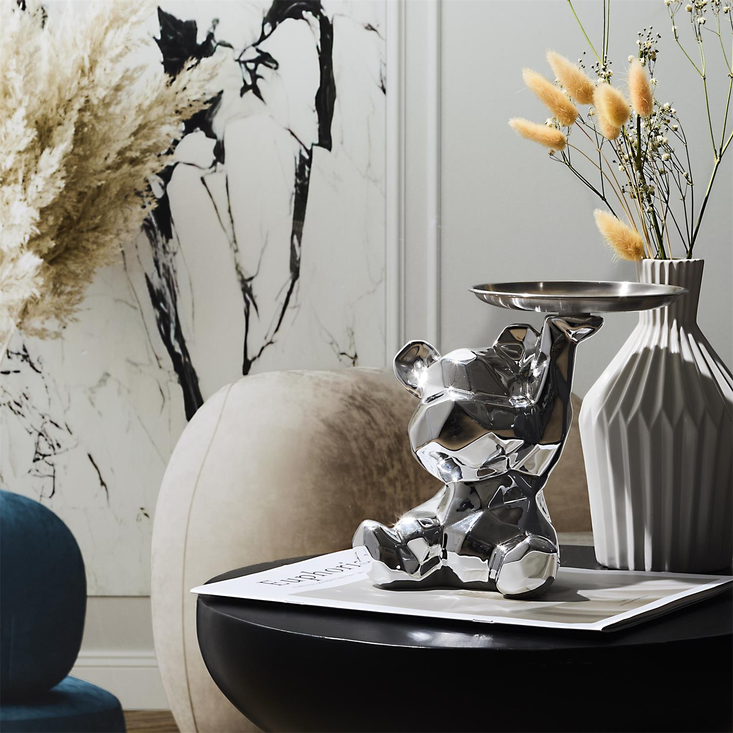 Ceramiczna figurka przypominająca misia ze złotą, metalową tacą to idealny element dekoracyjny, który zroi również porządek z kluczami lub innymi drobnymi przedmiotami.