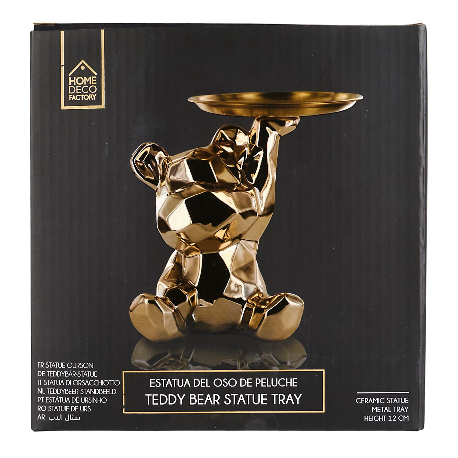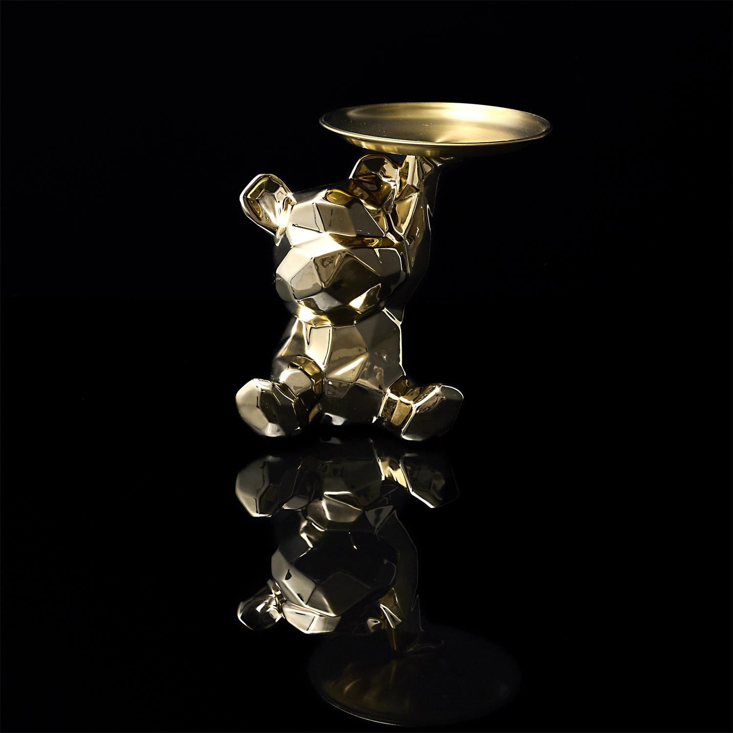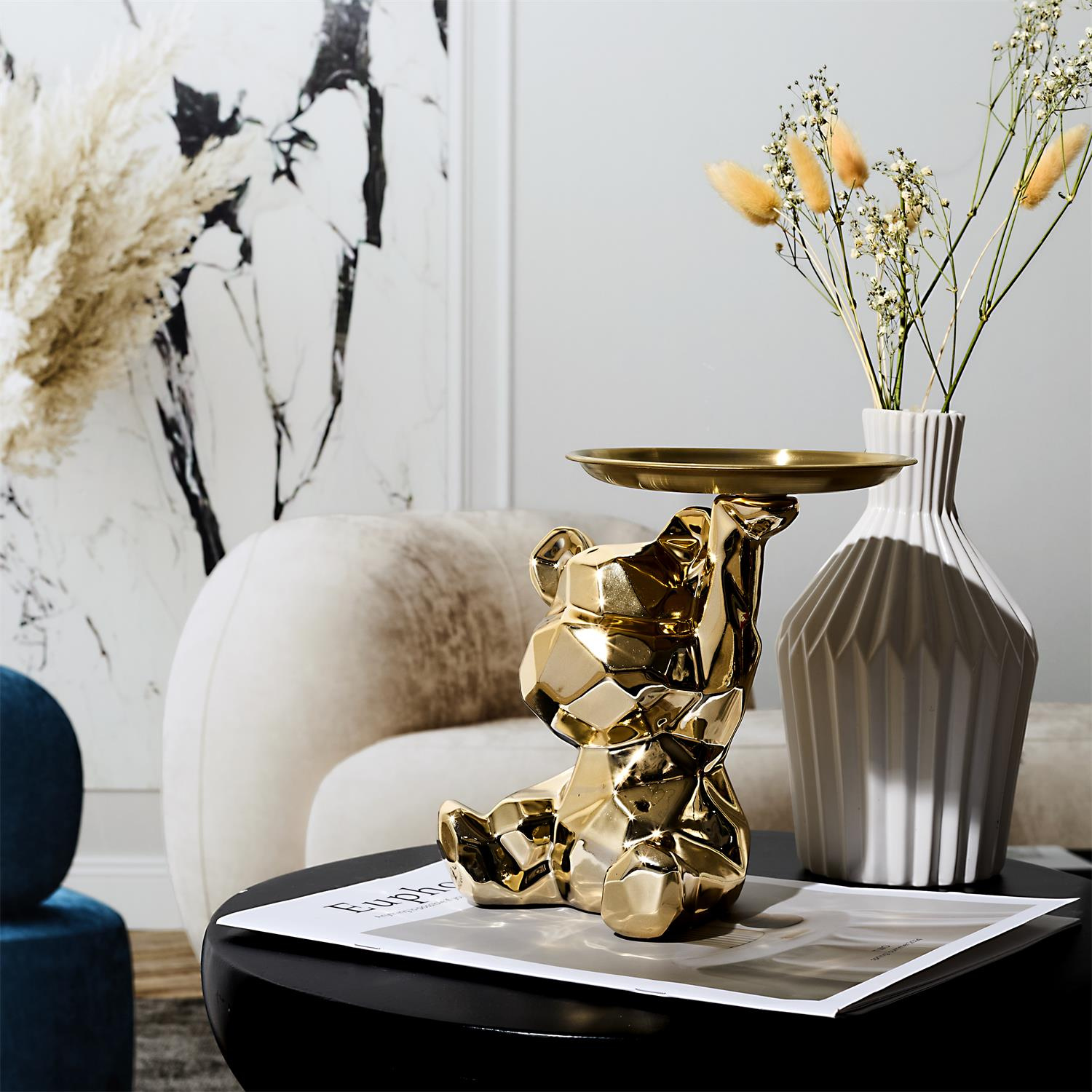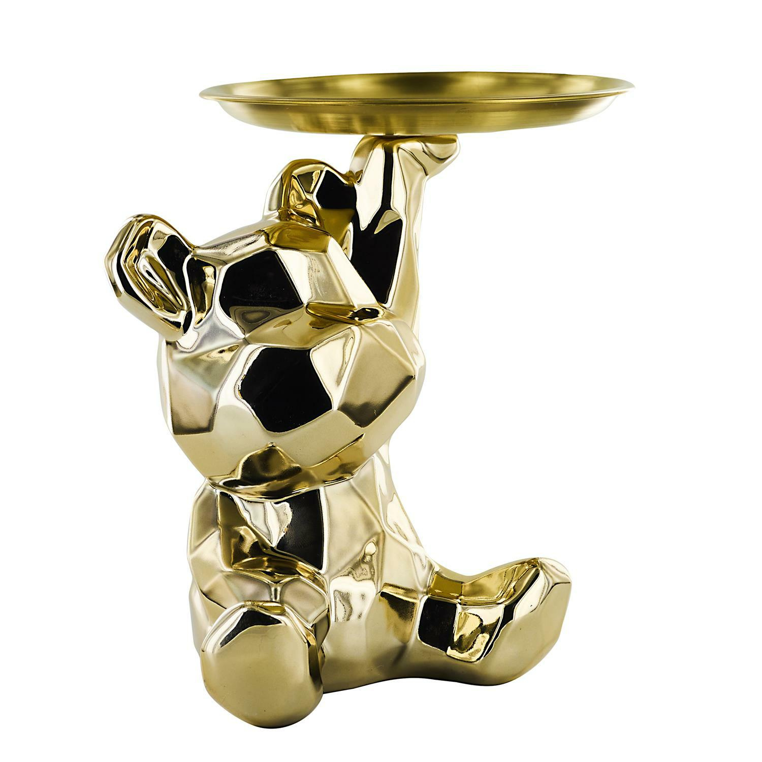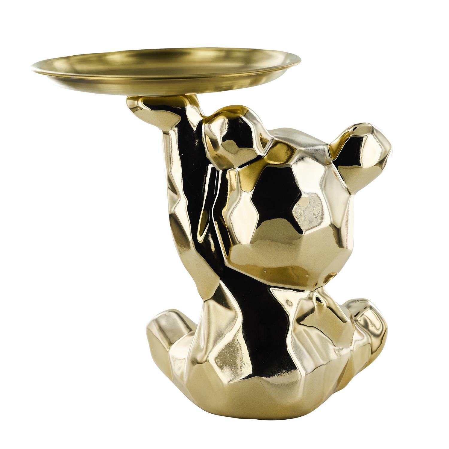 Ceramiczna figurka przypominająca misia ze złotą, metalową tacą to idealny element dekoracyjny, który zroi również porządek z kluczami lub innymi drobnymi przedmiotami.