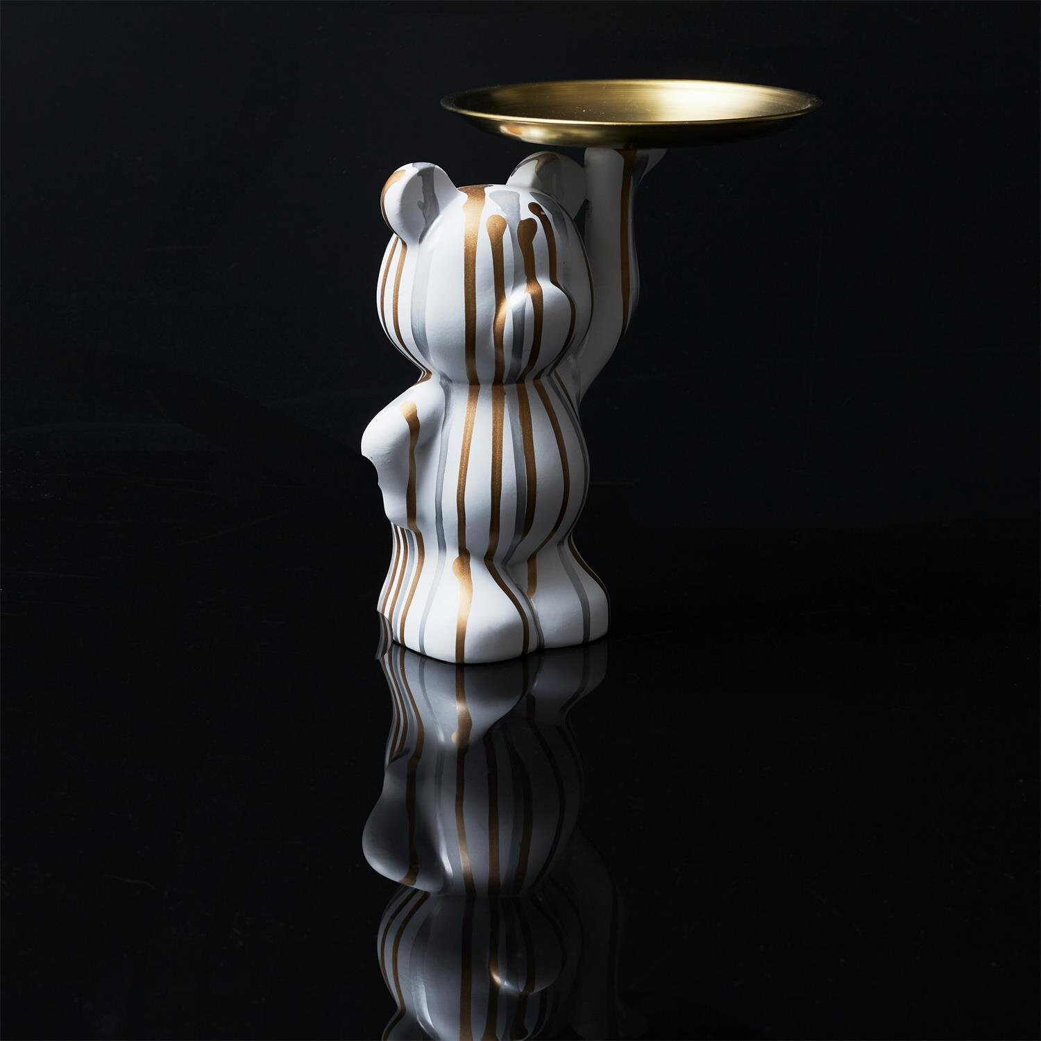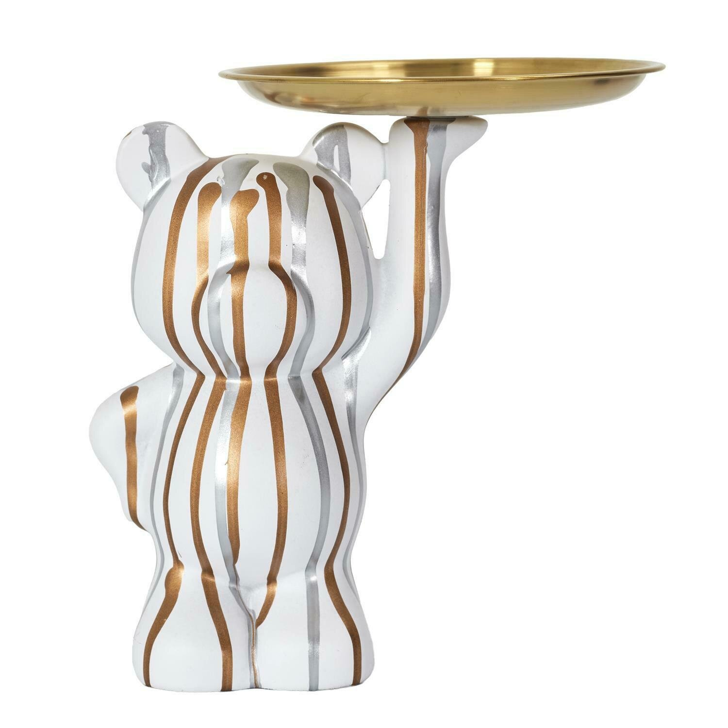 Figurka dekoracyjna przedstawiająca misia trzymającego złotą tacę, która pełni funkcję zarówno ozdobną, jak i praktyczną. Wykonana z wysokiej jakości tworzywa sztucznego, figurka została pokryta eleganckim, matowym wykończeniem w kolorze białym, ozdobionym nieregularnymi, metalicznymi paskami w odcieniach złota i srebra, co nadaje jej nowoczesny, artystyczny wygląd. Złota taca umieszczona na podniesionej łapie misia doskonale sprawdzi się do przechowywania drobnych przedmiotów, takich jak biżuteria, klucze, czy ozdoby, dodając wnętrzu wyrafinowanego charakteru. Figurka świetnie wpasuje się w aranżacje nowoczesne, glamour, a także eklektyczne, stanowiąc unikalny akcent na komodzie, stoliku kawowym czy toaletce.