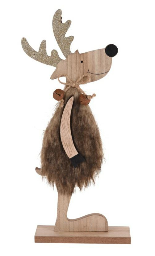 Figurka o kształcie renifera wykonana została z połączenia sklejki oraz tkaniny. Delikatne, ozdobne akcenty jak dzwoneczek czy czarne kopytka dodają figurce ciekawego wyglądu. Figurka ozdobiona jest tylko po jednej stronie.