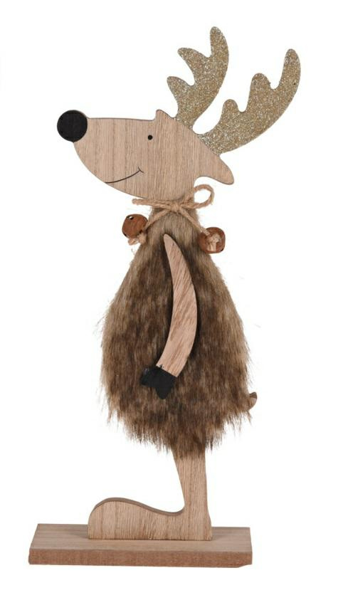 Figurka o kształcie renifera wykonana została z połączenia sklejki oraz tkaniny. Delikatne, ozdobne akcenty jak dzwoneczek czy czarne kopytka dodają figurce ciekawego wyglądu. Figurka ozdobiona jest tylko po jednej stronie.