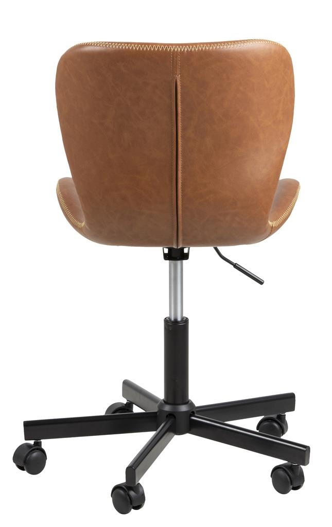 Wygodny, miękki fotel biurowy Batilda to przede wszystkim wyprofilowany fotel, który nie tylko podpiera plecy, ale równie daje oparcie biodrom oraz łopatką. Fotel Batilda wyposażony został w siedzisko wypełnione miękką pianką tapicerską oraz wykończone skórą ekologiczną PU retro leather look brandy 691B. Gładka struktura tkaniny sprawia, że fotel wygląda klasycznie. Fotel posiada regulowaną wysokość. Podstawą fotela jest metalowe ramie z pięcioma kółkami z tworzywa. Fotel jest również obrotowy. Max. wysokość 87cm, Max, wysokosć siedziska: 51,5cm Min.wysokosć: 80cm, Min wysokośc siedziska: 44,5cm Ilość kartonów: 1 Wymiary kartonów: 55x58x43cm Waga kartonów: 9,3kg