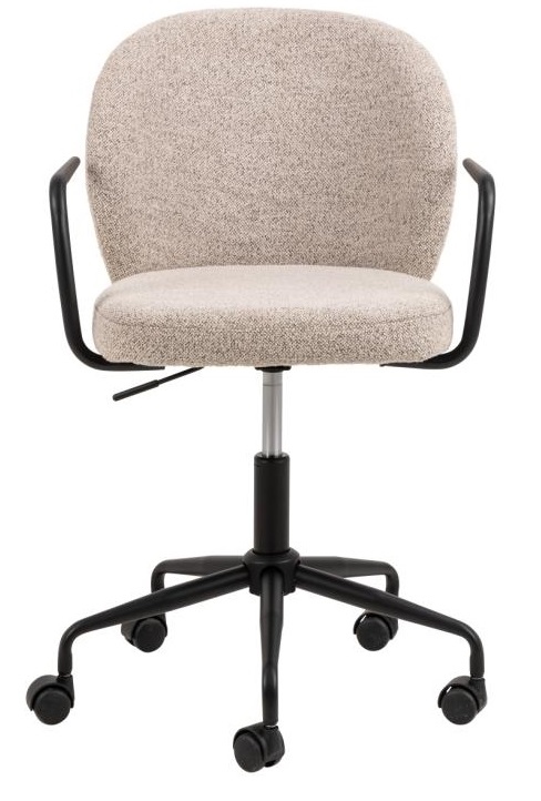 Wyróżniające się wyrafinowanym wyglądem krzesło do biurka ma zaokrąglone oparcie, rurowe czarne podłokietniki i miękką beżową tapicerkę typu bouclé. Wsparte na 5-gwiazdkowej obrotowej podstawie z kółkami z miękkim hamulcem i podnośnikiem gazowym, krzesło umożliwia płynny ruch i łatwą regulację wysokości. Krzesło zostało zaprojektowane z myślą o podniesieniu standardu domowego miejsca pracy. Krzesło do biurka z regulacją wysokości i podłokietnikami . Tapicerowane teksturowanym beżowym materiałem przypominającym bouclé . Podnośnik gazowy, funkcja obrotu i kółka z miękkim hamulcem . Podnośnik gazowy umożliwia regulację wysokości siedziska w zakresie 45-55 cm. 5-gwiazdkowa stalowa podstawa malowana proszkowo na czarno . Kółka z hamulcem dla bezpieczeństwa i funkcja obrotowa dla łatwego przemieszczania . Szerokość siedziska: 47cm Głębokośc siedziska: 45cm Wysokośc oparcia 39,5cm Wymaga montażu. Max obciążenie 110kg. Waga fotela: 9,7kg Wymiary kartonu:62x59x52cm