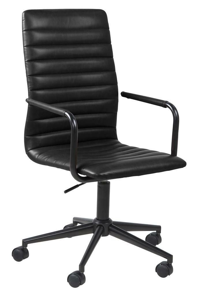 Fotel biurowy Winslow to wygodny obrotowy fotel z podłokietnikami. Siedzisko oraz oparcie krzesła zostało obite miękką czarną skórą. Poziome regularne przeszycia na fotelu dodają mu nowoczesnego wyglądu. Podłokietniki fotela również zostały obite skórą. Chromowana podstawa fotela wyposażona została w pięć obrotowych kółek. Fotel posiada regulację wysokości. Fotel posiada opcję automatycznego blokowania się kółek. Opcja ta polega, iż w momencie, gdy na fotelu nikt nie siedzi, utrudnione jest przesunięcie fotela, natomiast w momencie, gdy na nim siedzimy kółeczka obracają się delikatnie i płynnie. Max. obciążenie: 120 kg Max. ilość sztuk w kartonie: 1 Wymiary kartonu: 68 cm x 59 cm x 48 cm Wysokość siedziska: 52 cm Szerokość siedziska: 44,5 cm Głębokość siedziska: 42 cm Wysokość podłokietników: 20 cm