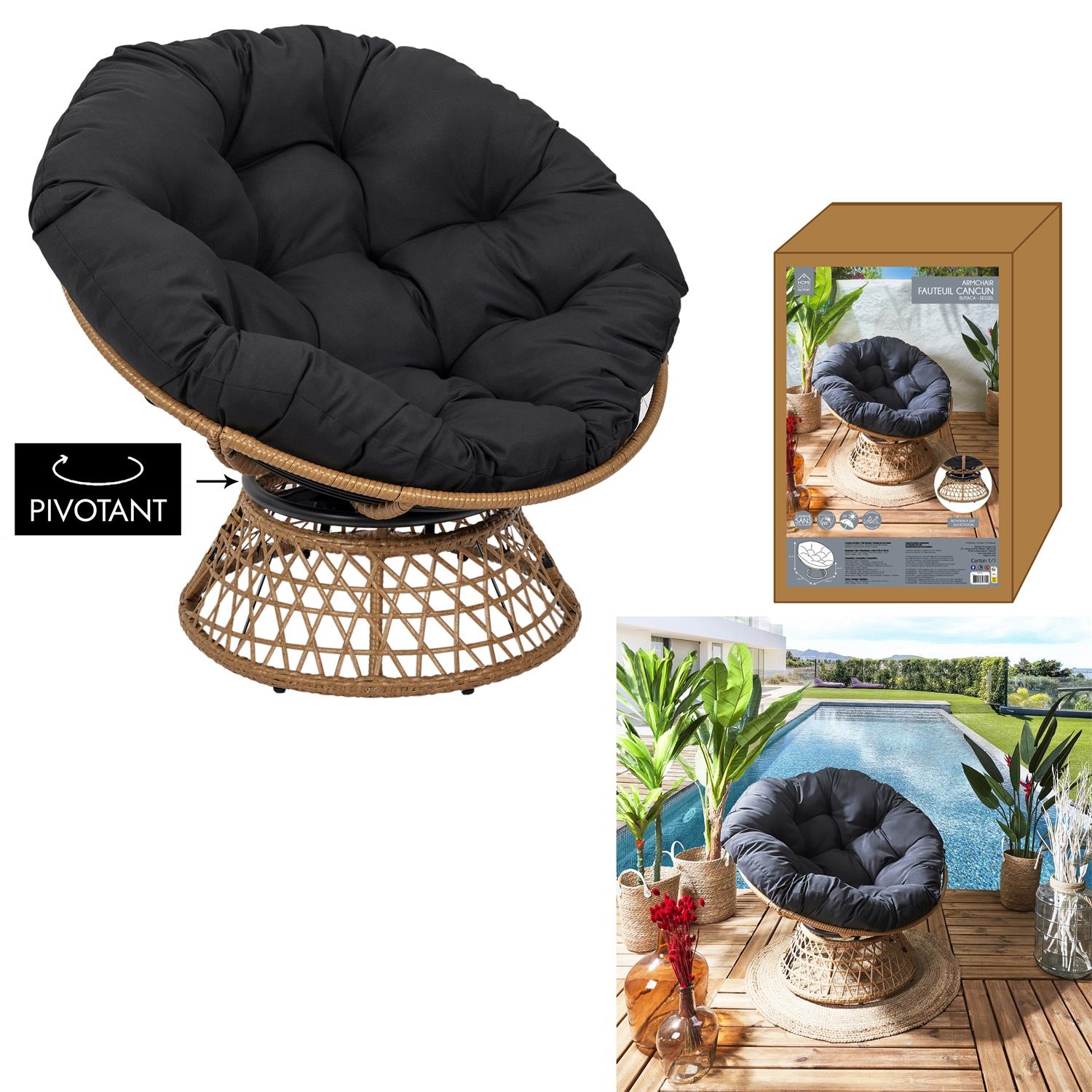Pleciony fotel Cancun to nawiązanie do naturalnego stylu b oho, który charakteryzuje się plecionkami w kolorze drewna oraz delikatnymi, lekkimi formami. Ten fotel taki właśnie jest. Miękkie okrągłe siedzisko wykończone poduszką, którą można zdjąć. Poduszka do ramy fotela montowana jest na taśmy, które przywiązujemy. Stelaż fotela nawiązujący do rattanowej plecionki, wykonany został z metalu pokrytego tworzywem sztucznym. Obrotowe siedzisko pozwala nie tylko na wygodny odpoczynek, ale również na obrócienie się np. w stronę słońca pdczas opalania na tarasie. Fotel wymaga montażu. Fotel nadaje się do użytku zewnętrznego (nalezy natomiast chronić poduszkę przed warunkami atmosferycznymi) Max. obciążenie 120kg. Wymiary kartonu: 95x65x32cm, Waga 15,5kg