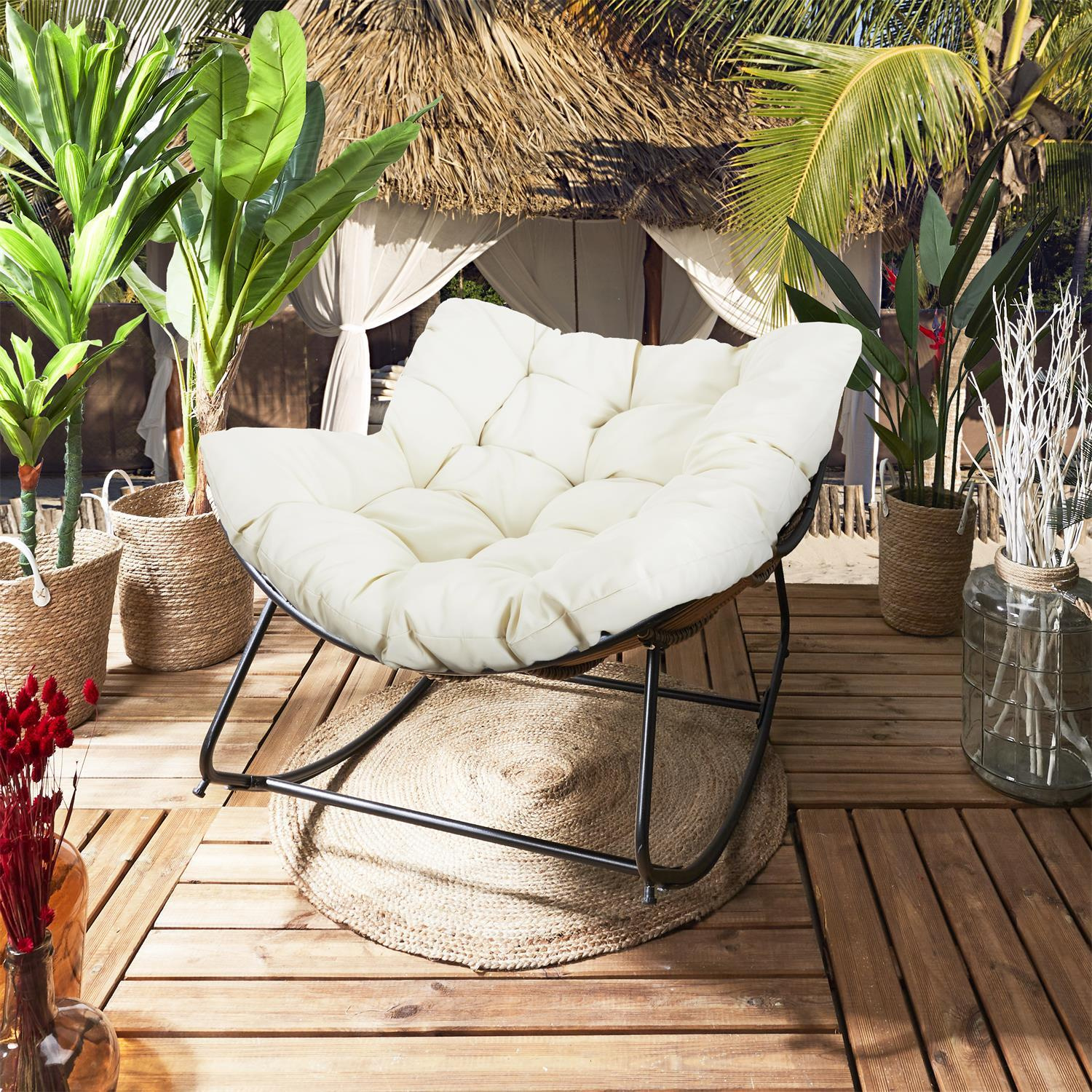 Fotel Tulum to sposób na wyjątkowy relaks w ogrodzie. Konstrukcja fotela składa się z bardzo szerokiego siedziska i metalowych płóz wyposażonych w ograniczniki gwarantujące bezpieczeństwo. Do produkcji wykorzystano stal lakierowaną proszkowo, elementy plastikowe, piankę oraz wytrzymałą tkaninę poliestrową. Fotel wyposażony jest w bardzo dużą poduszkę pokrywającą całe siedzisko łącznie z oparciem. Fotel wymaga montażu. Fotel nie sztapluje się. Waga fotela: 11,3kg, Fotel nadaje się do użytku na zewnątrz.