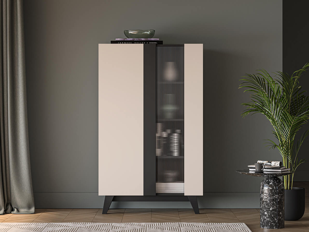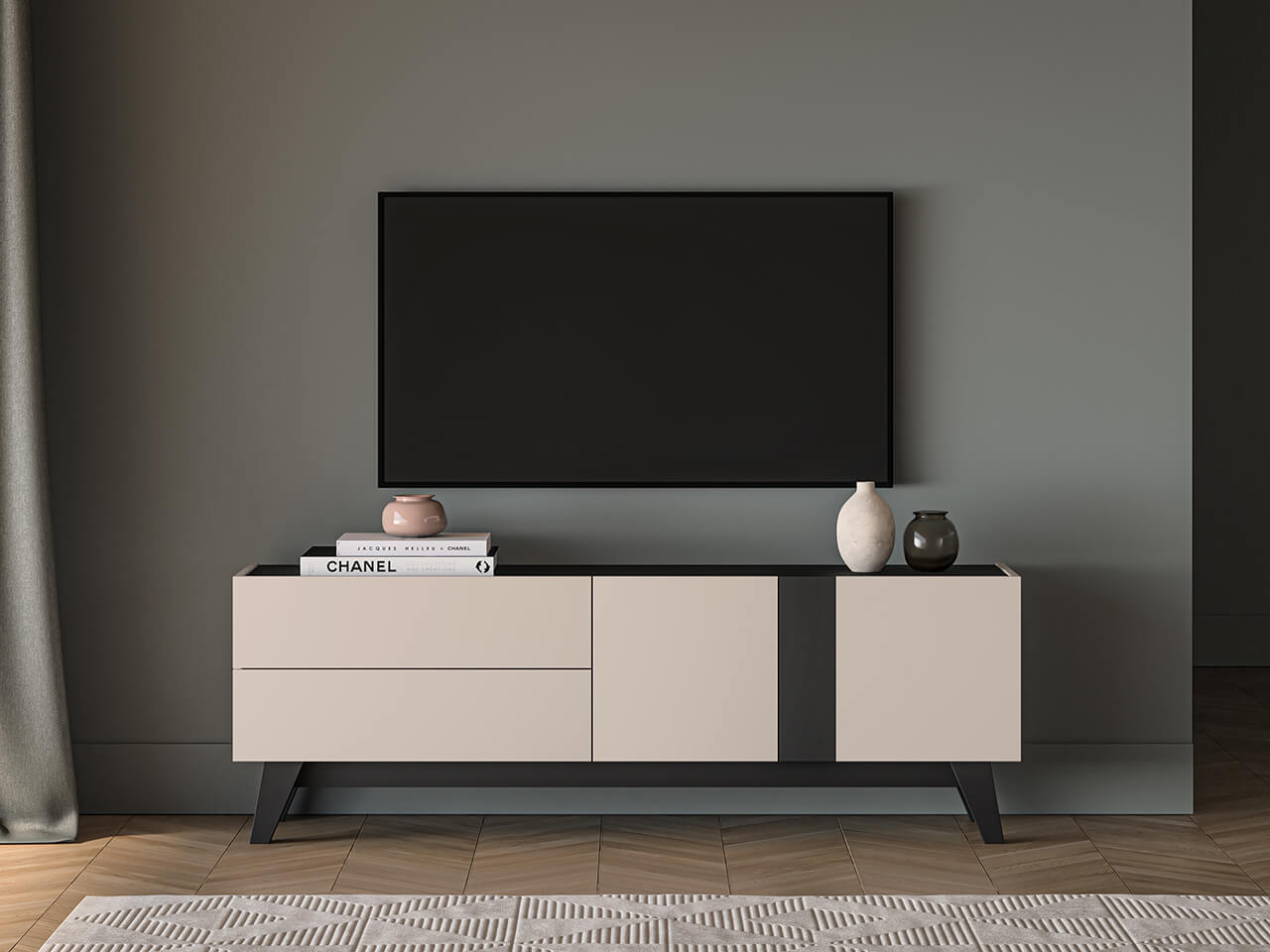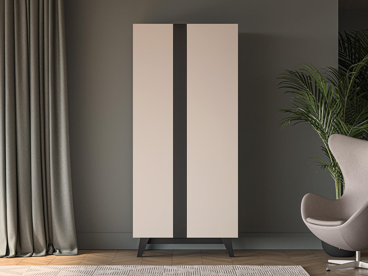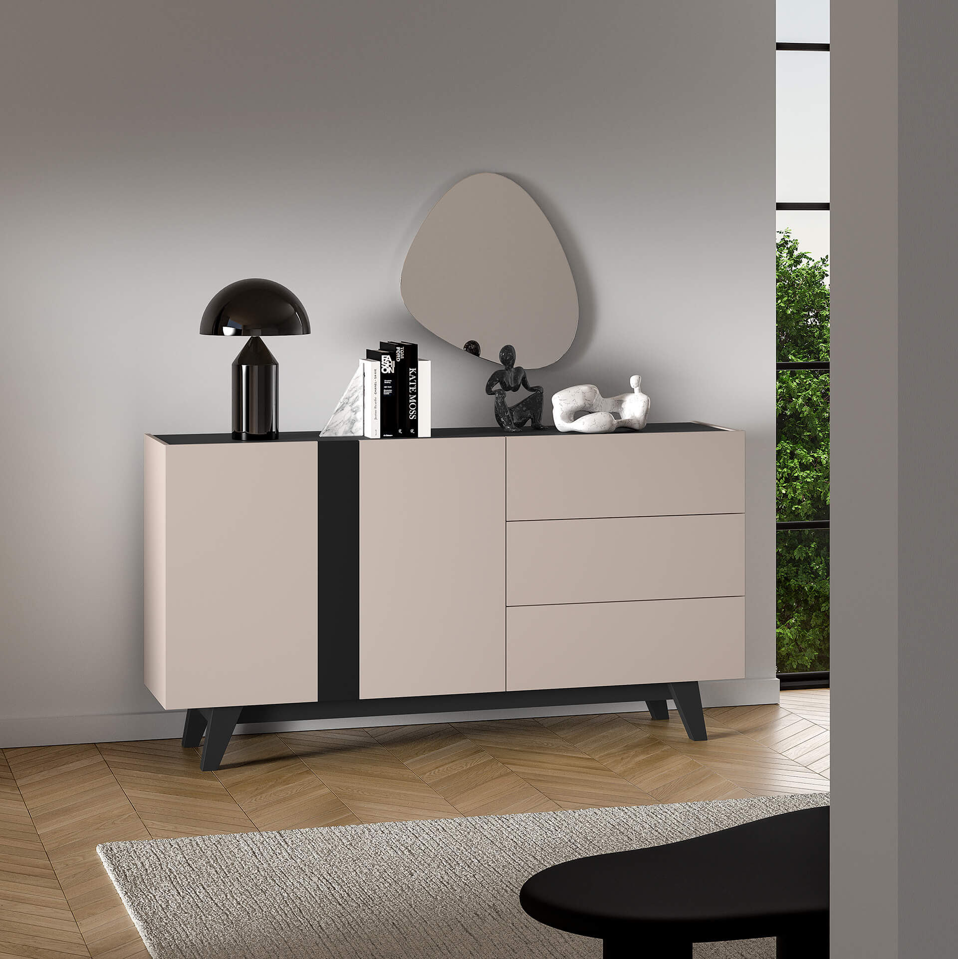 Wyrafinowany kaszmirowy kolor frontów i boków dopełniliśmy klasycznie czarną wstawką, blatem i podstawą. Stylowe nóżki dodają meblom lekkości i wyjątkowego charakteru, a bezuchwytowe fronty dodatkowo podkreślają współczesny design. Starannie wyselekcjonowane typy brył pozwolą zaaranżować wiele wnętrz, niezależnie od ich metrażu.