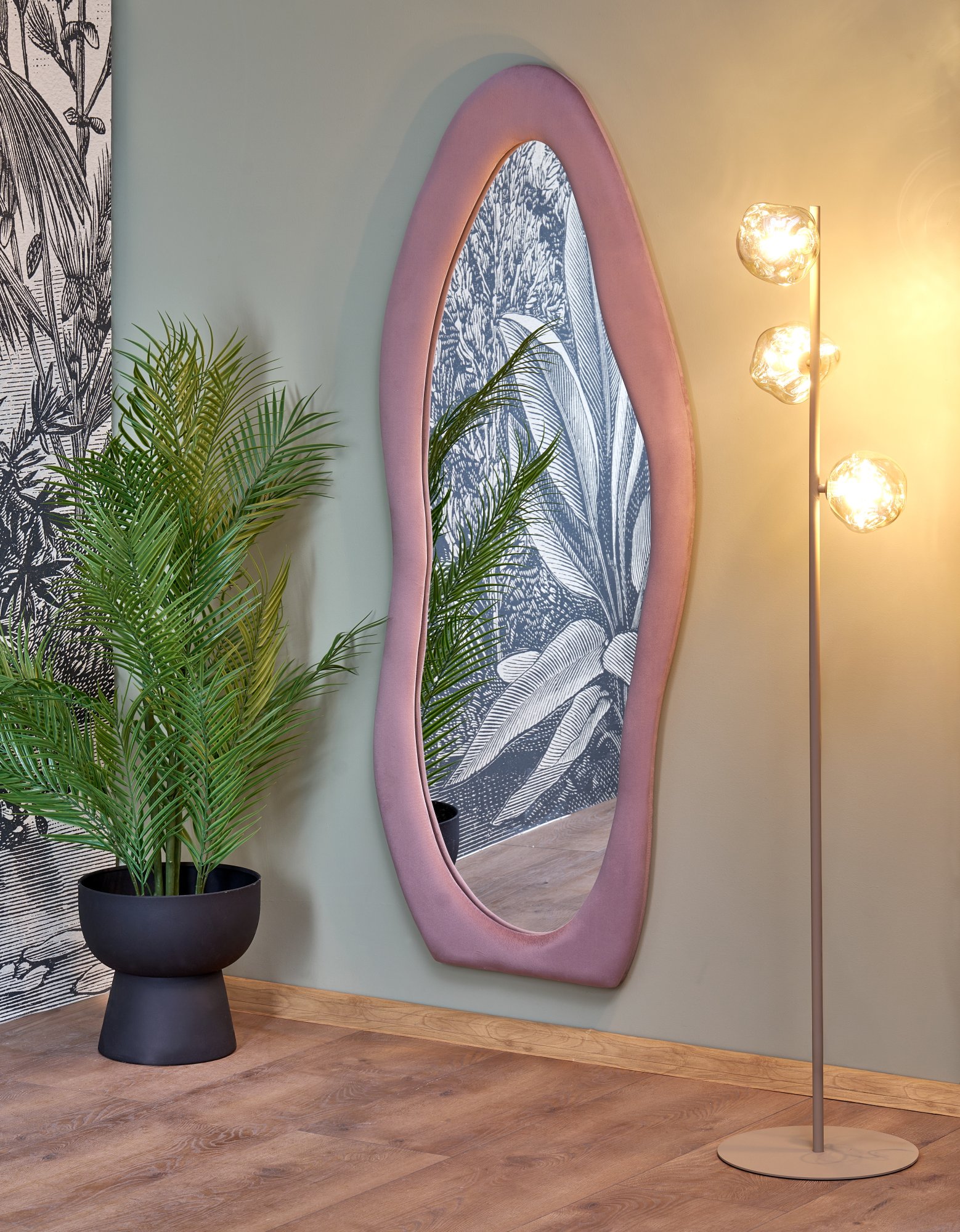 lustro stojące lub ścienne, wymiary: 160/60 cm, materiał: lustro / tkanina velvet / płyta MDF, kolor: jasny różowy