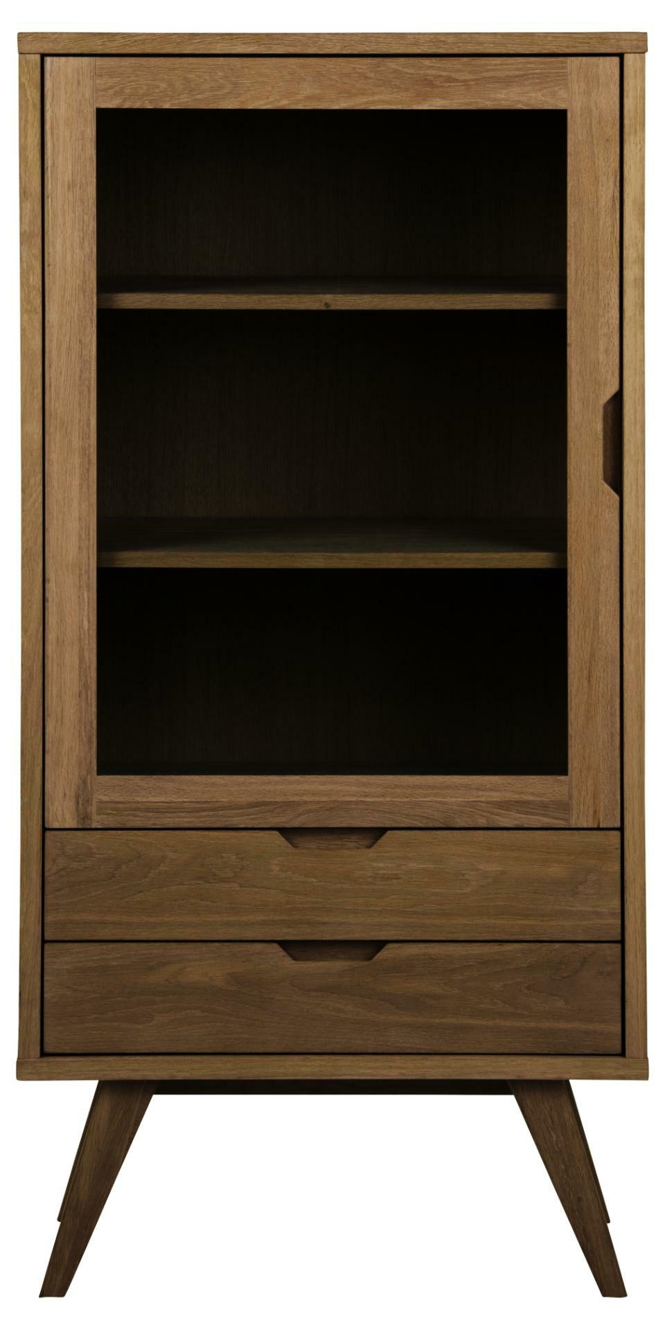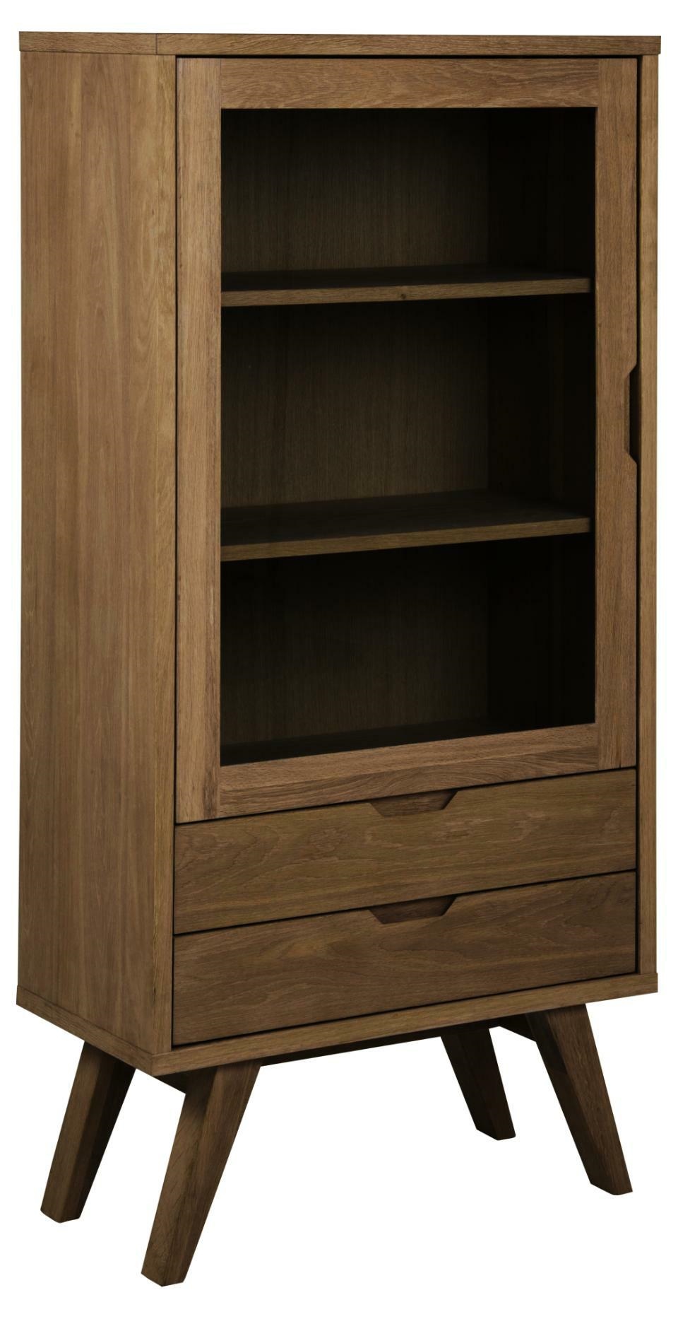 Poznaj gablotę, która zapewnia dużo miejsca do przechowywania i wnosi odrobinę skandynawskiego stylu Gablota A-Line to stylowy mebel o wymiarach 72x36x145 cm, łączący elegancję z funkcjonalnością. Wykonana z forniru dębowego lakierowanego w kolorze ciemnego drewna. Dzięki 2 szufladom i 2 półkom za przezroczystymi szklanymi drzwiami, porządkowanie jest łatwe. Drzwi z hartowanego szkła zapewniają trwałość i bezpieczną ekspozycję przedmiotów, a metalowe prowadnice w szufladach gwarantują płynne otwieranie. Podstawa z forniru dębowego zapewnia stabilność, podkreślając nowoczesny design gabloty, idealnej do każdego wnętrza. Wymaga montażu. Max. obciążenie na półkę 17 kg. Wymiary kartonu: 124x44x80 cm. Waga 48 kg