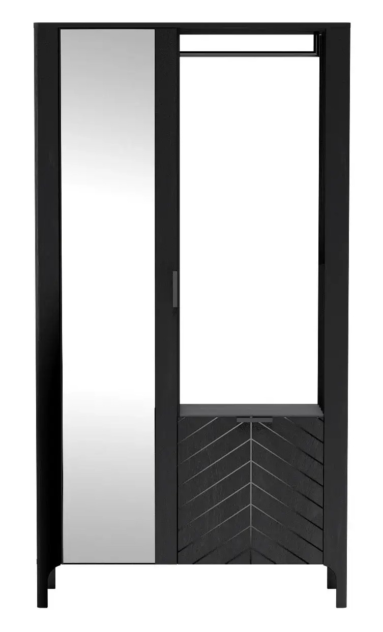 Elegancka i funkcjonalna garderoba, która łączy nowoczesny styl z praktycznym zastosowaniem. Wykonana z wysokiej jakości materiałów, zachwyca minimalistyczną formą i stonowaną kolorystyką, doskonale wpisując się w każde nowoczesne wnętrze. Wysokie lustro – umieszczone na jednym z frontów, optycznie powiększa przestrzeń i pozwala na szybkie sprawdzenie stylizacji. Garderoba posiada otwartą część z drążkiem, idealną do wieszania płaszczy, kurtek i innych ubrań. Zintegrowana dolna, zamykana szafka z dekoracyjnym wzorem pozwala na przechowywanie butów, toreb lub innych akcesoriów. Wykonana z wytrzymałych materiałów, które gwarantują trwałość i stabilność mebla. Minimalistyczna czarna kolorystyka z akcentami lustrzanymi podkreśla nowoczesny charakter garderoby.