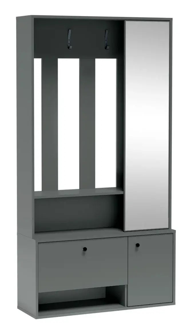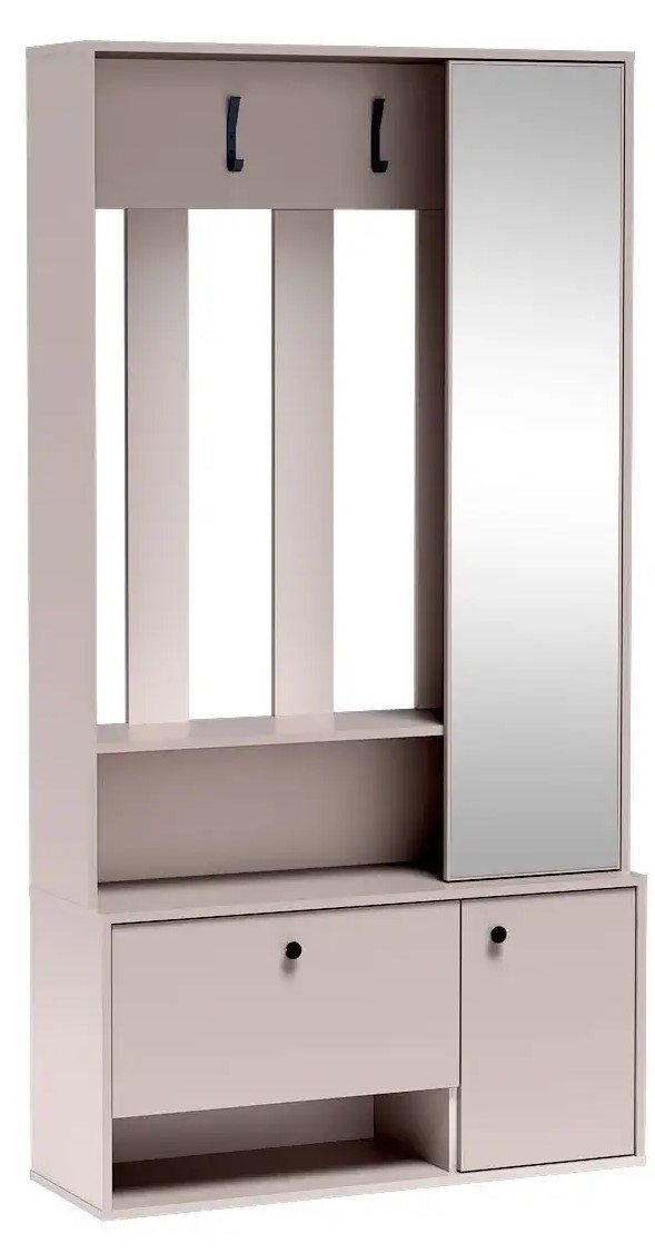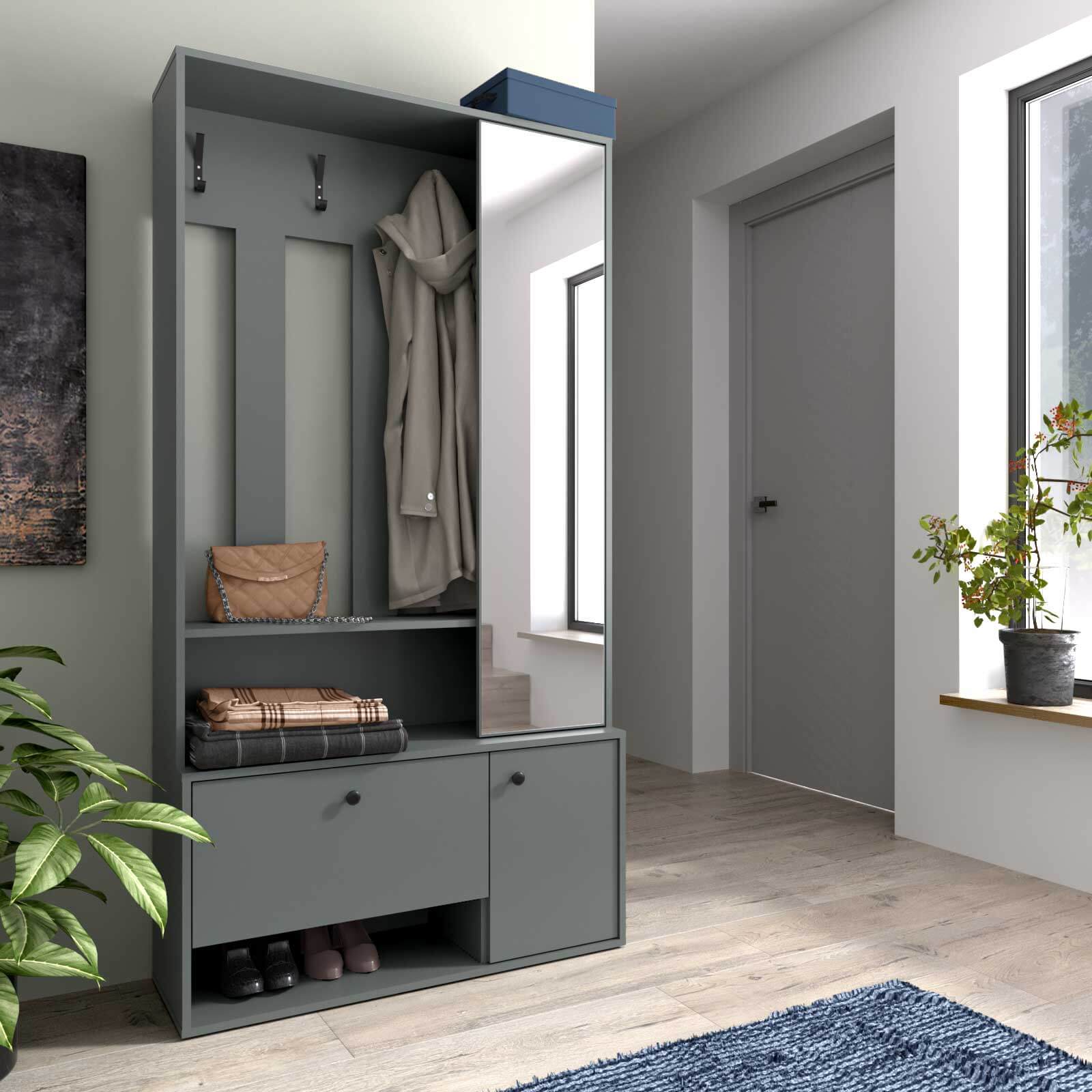 Garderoba to mebel, który potrzebny jest w każdym domu, to funkcjonalna szafa do przechowywania butów i odwieszenia kurtek na wieszaku. Nie może w niej zabraknąć lustra, w którym będziemy mogli się przejrzeć przed wyjściem z mieszkania. Nowoczesny wygląd sprawia, że garderoba wpasuje się w modowe trendy tego sezonu. Garderoba dostępna jest w trzech wersjach kolorystycznych: cała w kolorze kaszmir, stone green i grafit.