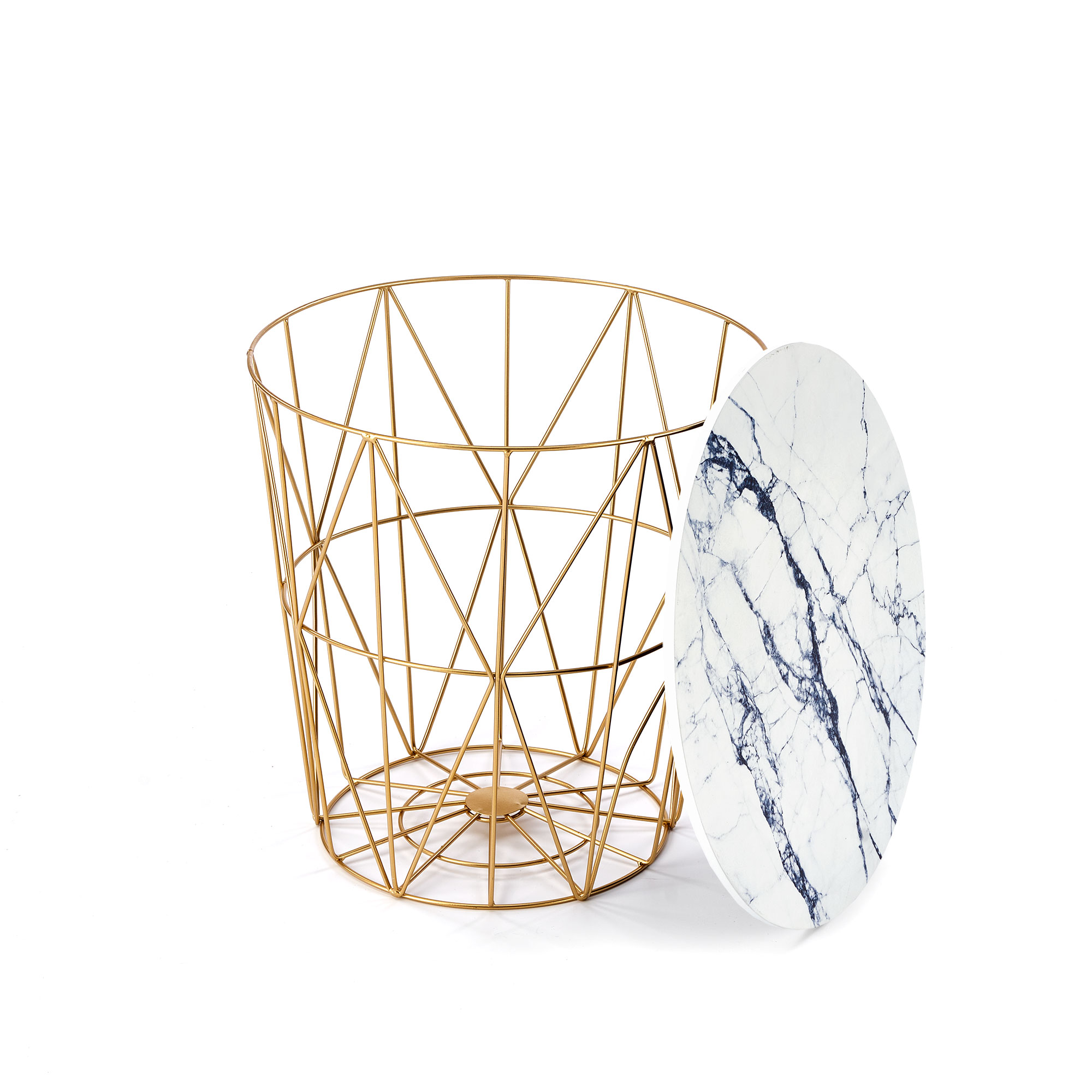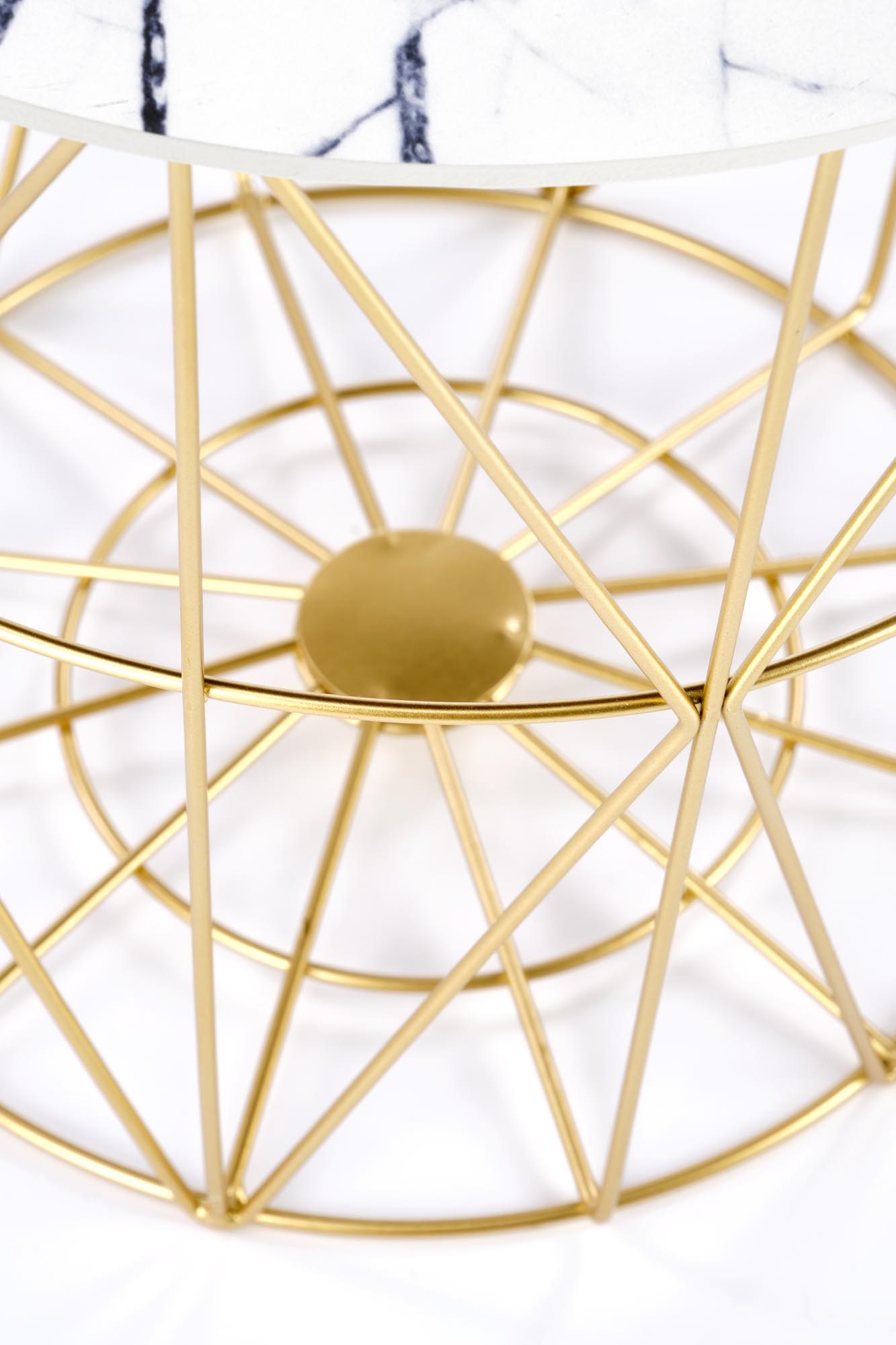 wymiary: fi 42/41 cm, materiał: MDF okleinowany / stal malowana proszkowo, kolory: stelaż – złoty, blat – biały marmur