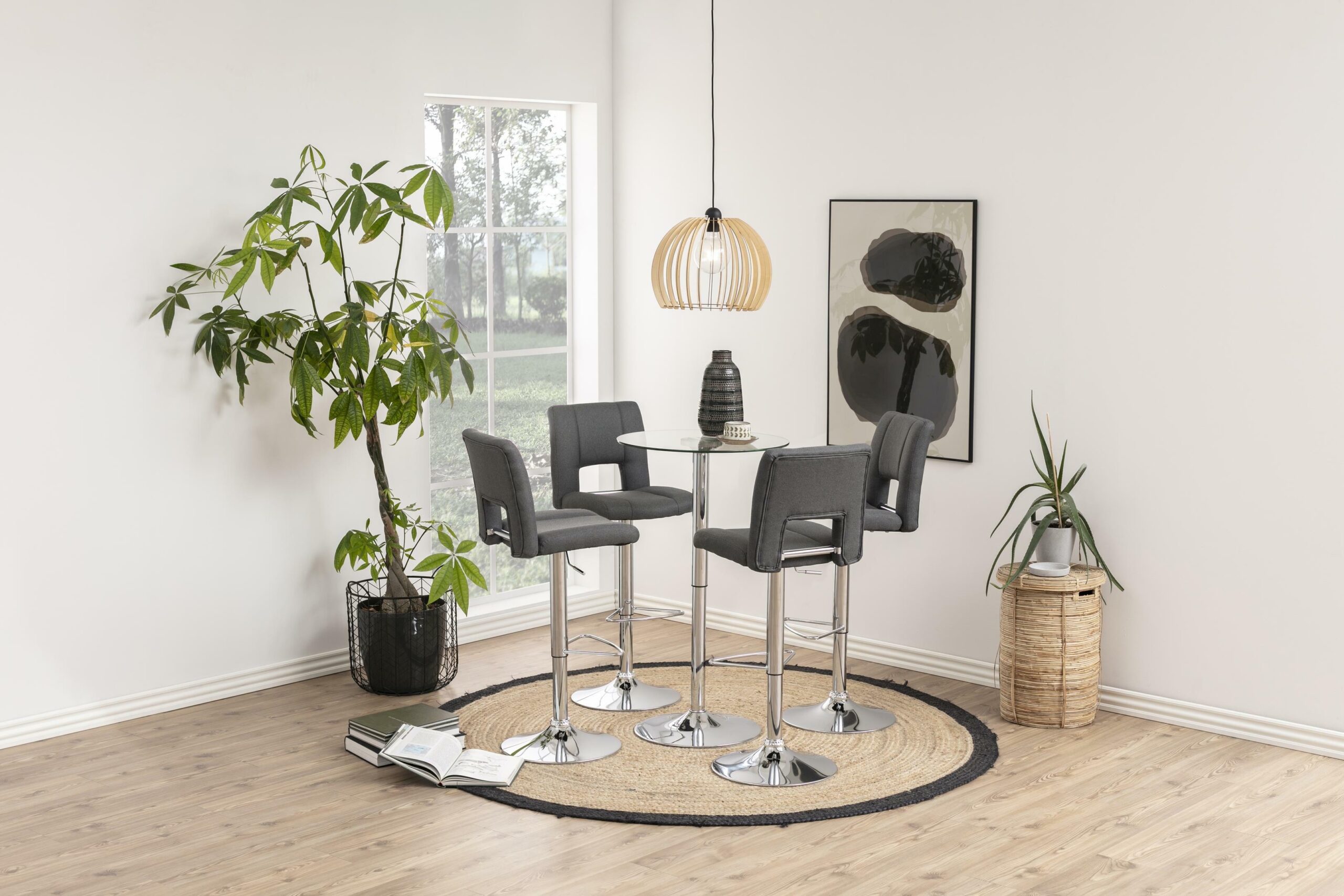 Hoker Sylvia to mebel do nowoczesnego baru lub jadalni. Siedzisko z pianki poliuretanowej pokryte jest tapicerką z tkaniny Corsica fabric dark grey 20. Podstawę stanowi długa, smukła noga ze szczotkowanego metalu w kolorze chromu. Hoker posiada wysokie, wygodne oparcie oraz dodatkowe podparcie dla nóg. Stołek posiada regulację wysokości. Ilość kartonów: 1 Wymiary kartonów: 60x44x44cm Waga kartonów: 10,5kg