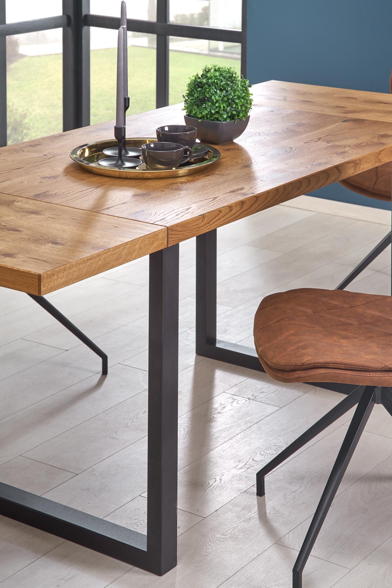 stół rozkładany, wymiary: 126÷206/80/76 cm, materiał: blat – płyta fornirowana, na obrzeżach drewno lite, nogi – stal malowana proszkowo, kolor: blat – jasny dąb, nogi – czarne