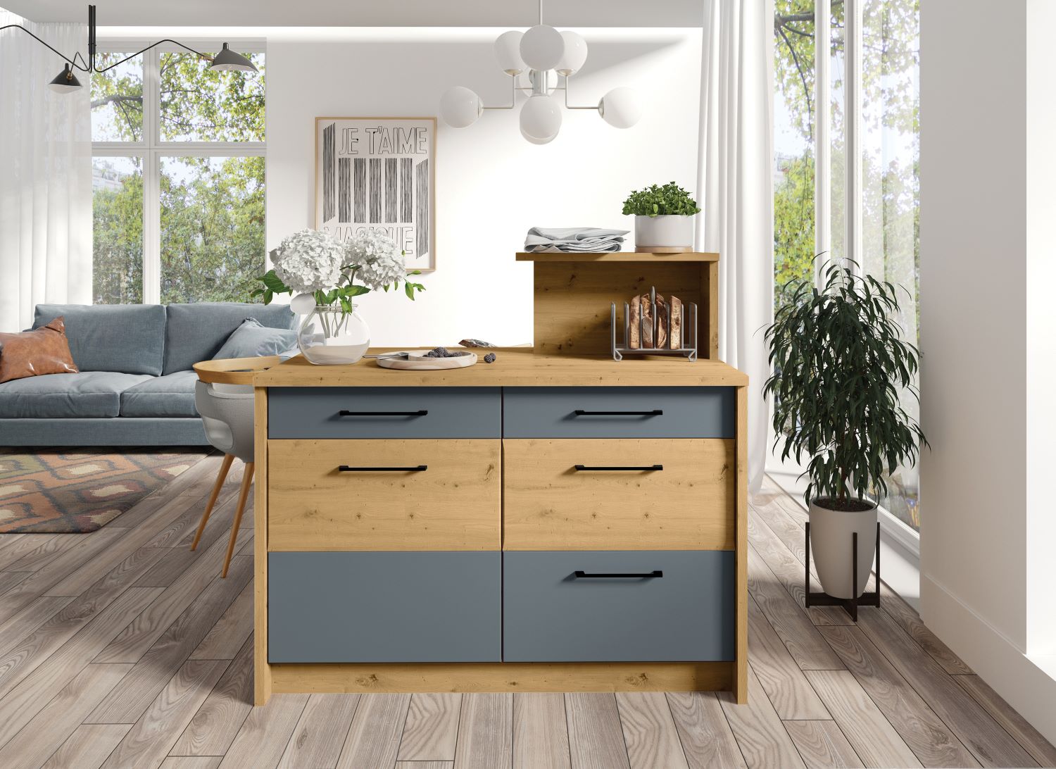 Fronty szafek zostały wykonane z płyty meblowej w szarym macie ze wstawką w dekorze artisan , białym połysku ze wstawką w dekorze artisan, kolorze latte w połysku ze wstawką w dekorze wood , natomiast korpusy są wykonane z płyty laminowanej w dekorze artisan.