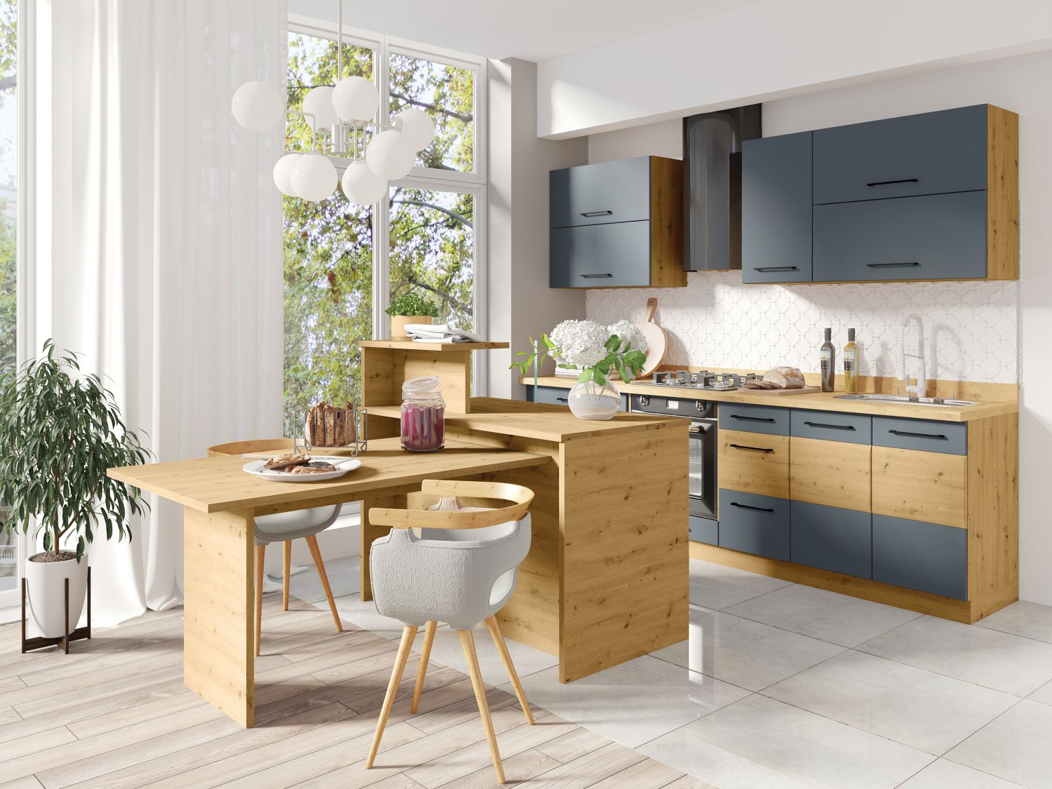 Szafki posiadają zawiasy z cichym domykaniem oraz szuflady i podnośniki do wyboru.
