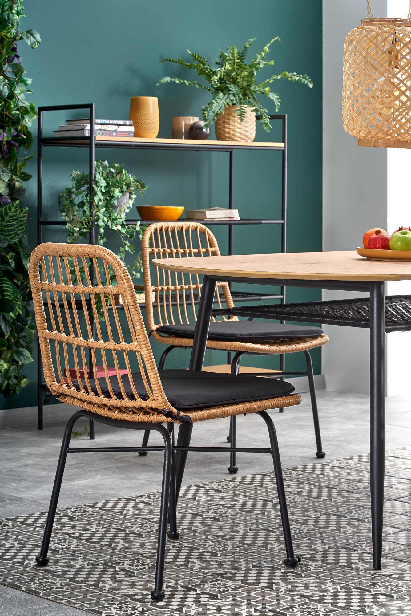 wymiary: 160/90/77 cm, materiał: MDF okleinowany / rattan syntetyczny / stal malowana proszkowo, kolor: blat – dąb złoty, nogi – czarny