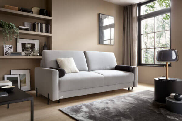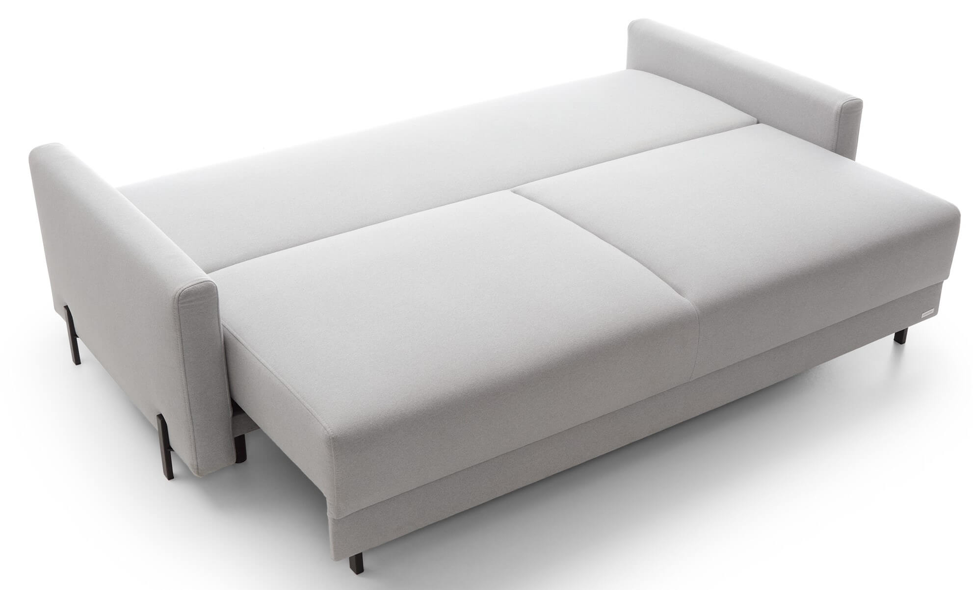 Bardzo wygodna funkcja spania – rozkładana przy pomocy automatu, bez odsuwania dolnej szuflady. Cała powierzchnia spania (137×190 cm), posiada zbliżoną sprężystość. Kanapa z dużym pojemnikiem na pościel.
