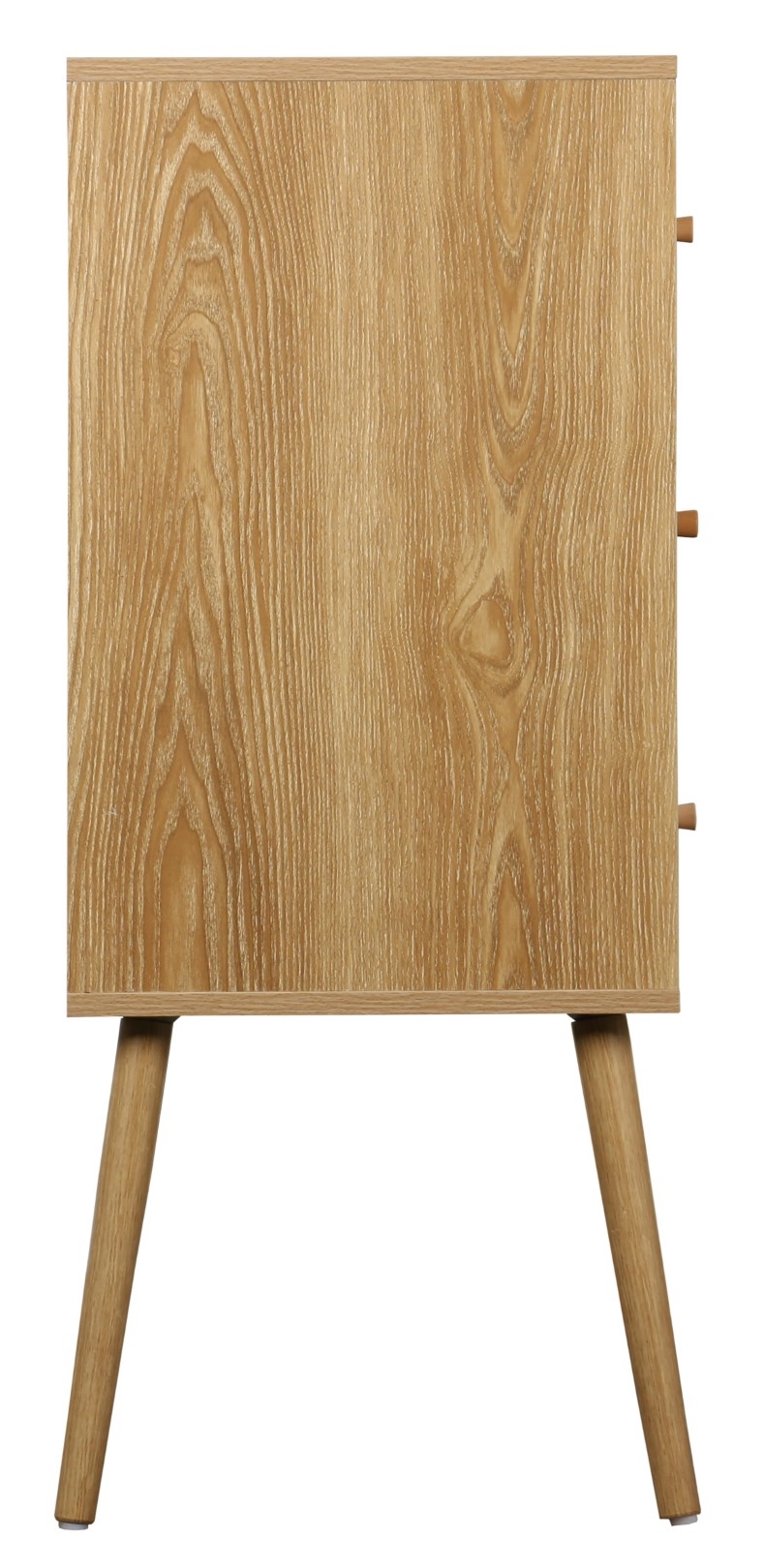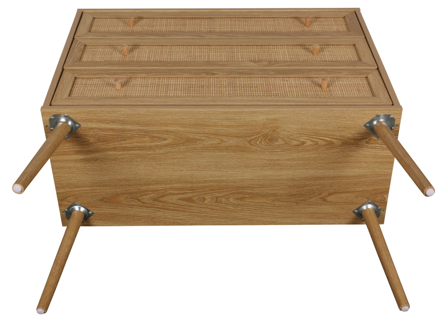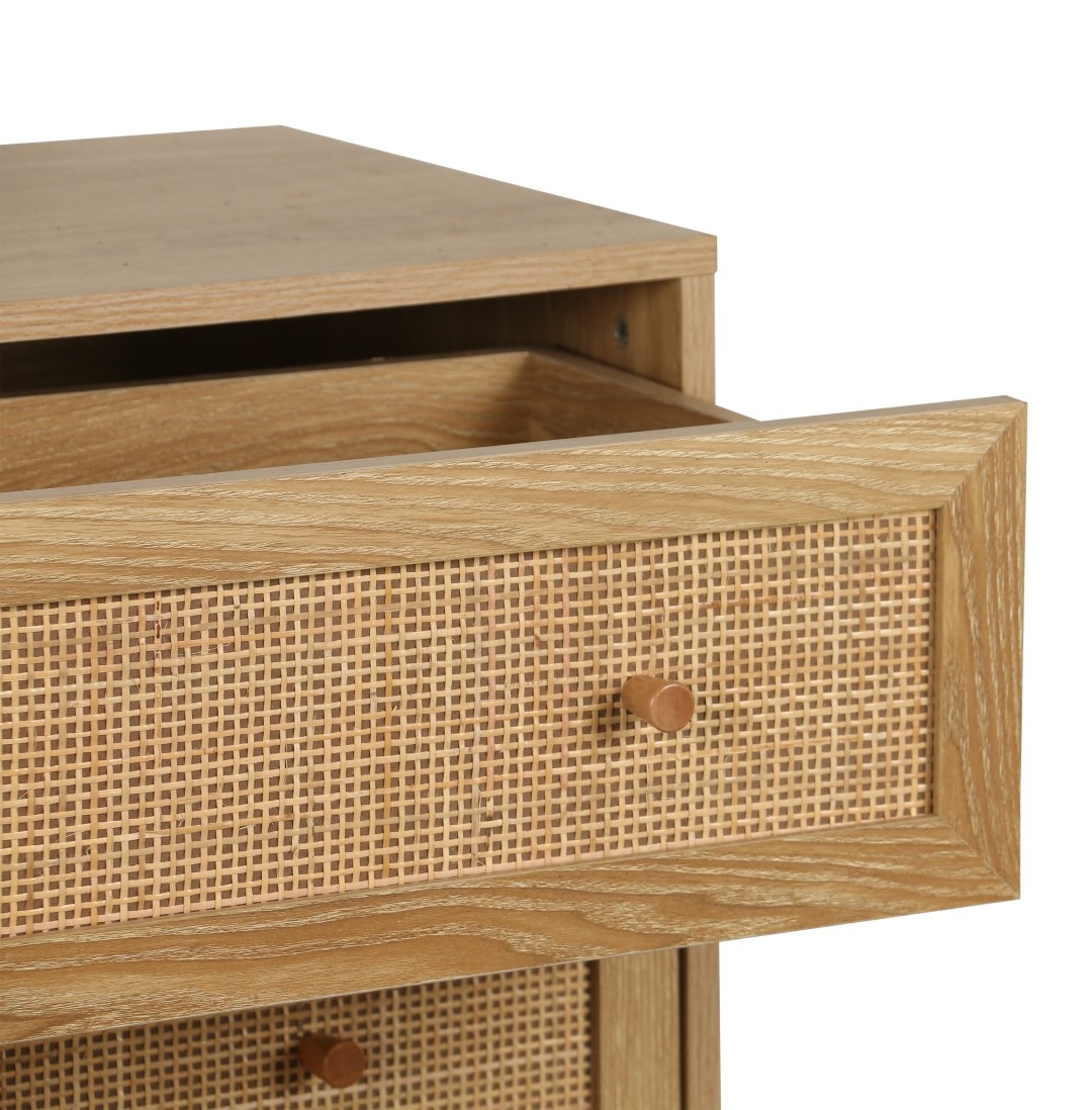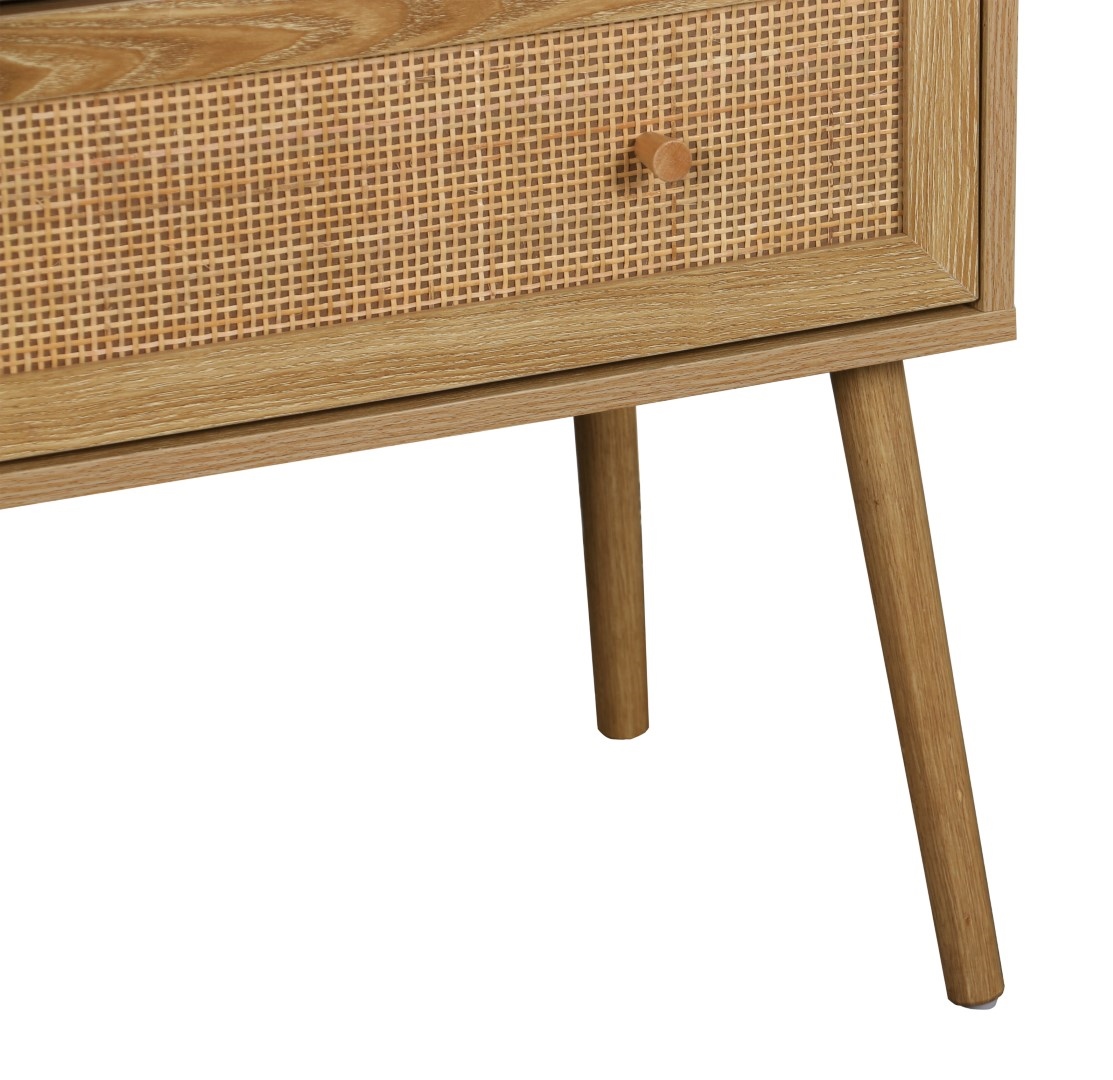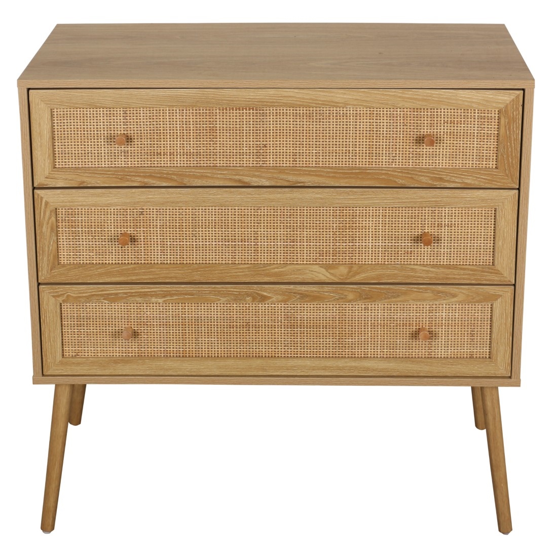 Komoda z 3 szufladami z serii Ballo to nowoczesny mebel w naturalnym stylu boho. Minimalistyczna konstrukcja ozdobiona naturalnymi materiałami jak rattan czy lite drewno sprawdzi się we wnętrzu spójnym z naturalnymi kolorami. Jasna szafka o ciepłym odcieniu drewna idealnie sprawdzi się w beżowym wnętrzu. Materiał korpusu: płyta wiórowa laminowana papierowym laminatem imitującym naturalny kolor dębu. Nogi komody wykonane z litego drewna sosnowego. Rattanowa dekoracja frontów. Szuflady komody otwierają się dzięki metalowym kulkowym prowadnicą. Wymaga montażu. Maksymalne obciążenie mebla 50 kg. Wymiary kartonu: 45x23x97cm