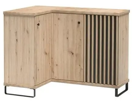 Często jest tak, że jeśli zaczynasz kupować meble do swojego salonu czy pokoju, brakuje pomysłu na zagospodarowanie przestrzeni w rogu pomieszczenia. Komody narożne są idealnym rozwiązaniem, nie musisz się martwić czy w kąt wstawić jakąś roślinę, lampę czy fotel. Taka szafa jest praktycznym rozwiązaniem. Nic nie musi leżeć, wszystkie przedmioty znajdą swoje miejsce. Komoda z modnymi lamelami w jednych z drzwi to mebel, który musi znaleźć się u Ciebie w domu. W środku komody znajdują się dwie półki, możesz ją postawić na metalowych nogach, co dopełni wystrój wnętrza w industrialnym stylu.