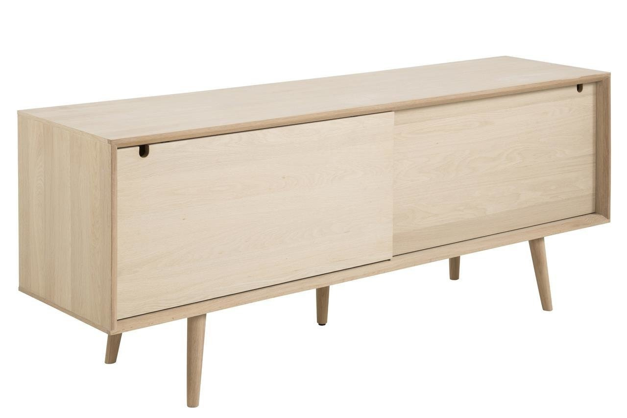 Komoda Century wykonana została z drewna oraz forniru dębowego. Komoda została dodatkowo pokryta warstwą oleju z białym pigmentem, który wydobywa piękno struktury drewna. Całość utrzymana została w stylistyce lat 60tych. Komoda posiada przesuwne panele, które mogą odkryć znajdujące się wewnątrz półki oraz szuflady bądź też je zakryć. Komoda posiada wewnątrz 5 szuflad.