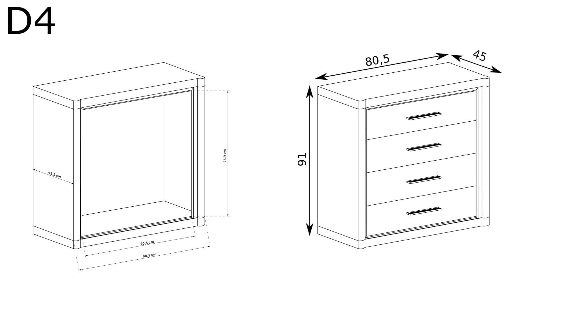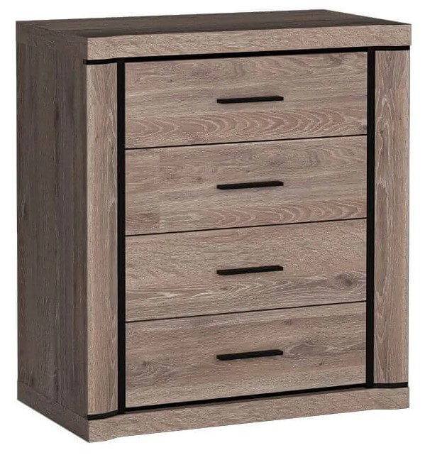 Komoda z kolekcji Dallas posiadająca cztery pojemne szuflady, które pomagają w codziennej organizacji oraz pozwalają na utrzymanie ładu i porządku. Mebel jest prosty lecz, poprzez czarne listwy staje się oryginalny, łamie standardy i szokuje. Metalowe uchwyty idealnie współgrają z całością komody. Pomieści wiele ubrań, akcesoriów a swoje miejsce znajdzie w każdym pomieszczeniu i wszędzie będzie pasować. Dostępna w dwóch wybarwieniach.