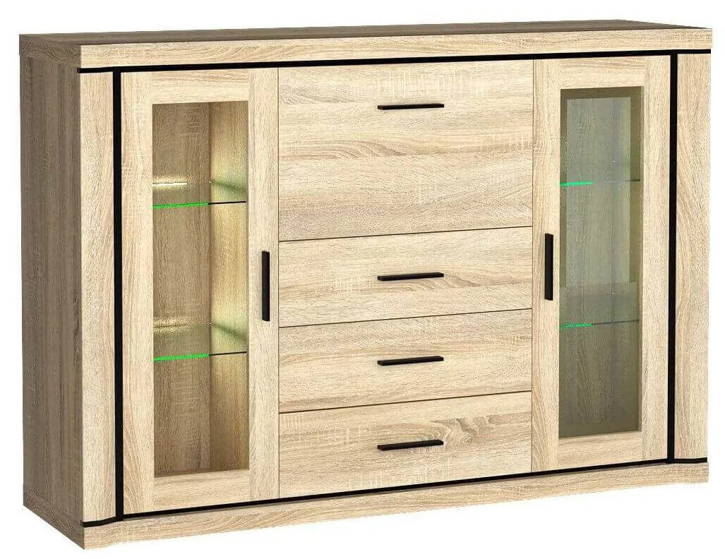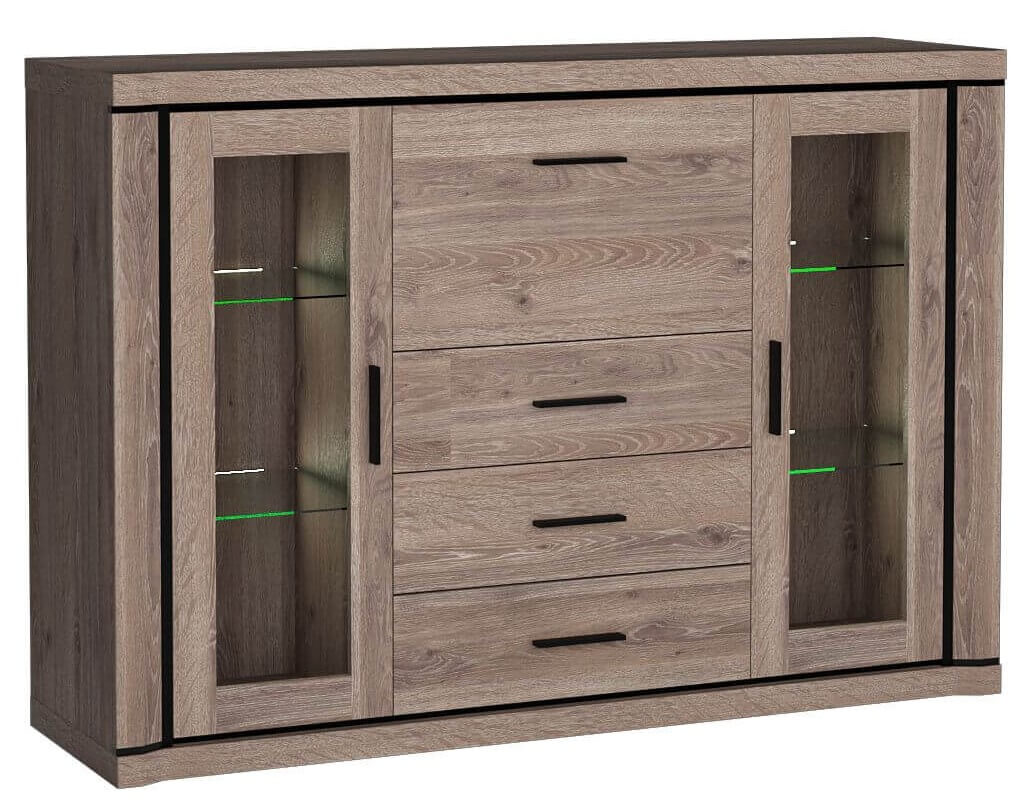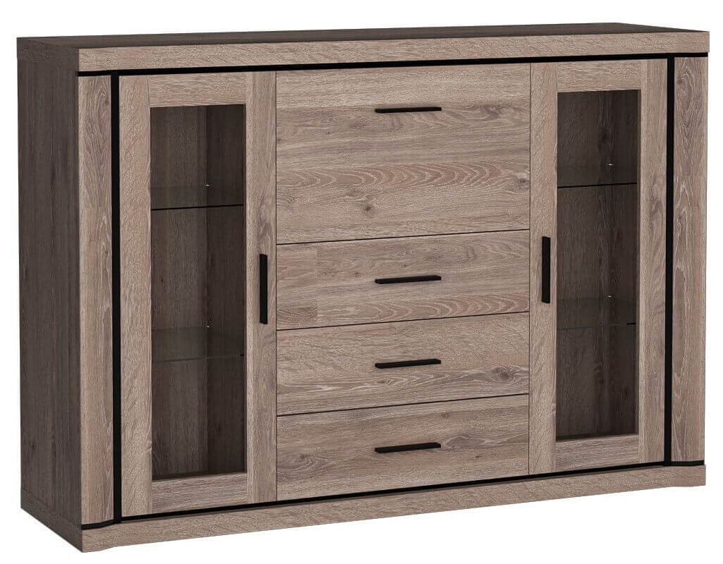 Komoda o wyjątkowej budowie z kolekcji Dallas składa się z trzech szuflad, ot otwierającego się w dół barku oraz dwóch szklanych szafek, a za każdą z nich umieszczone są po dwie szklane półki. Witryna daje nam wiele możliwości organizacji, pomieści wiele ubrań, akcesoriów, dokumentów, jest idealna do eksponowania zestawu ulubionej porcelany, pamiątek bądź ozdób. Posiada czarne wstawki w postaci listew, które razem w połączeniu z metalowymi uchwytami tworzą niepowtarzalny wygląd. Komoda będzie wyglądać dobrze w każdym domu, mieszkaniu bądź gabinecie. Dostępna w dwóch wybarwieniach.