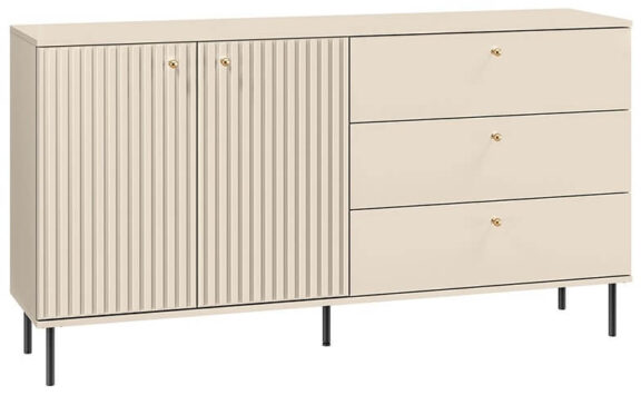 Komoda na czarnych metalowych nogach to połączenie nowoczesnego stylu z elegancją. Fronty komody ozdobione lamelami nadają jej charakteru, a złote uchwyty dodają subtelności. Idealna propozycja dla tych, którzy szukają funkcjonalnego i stylowego mebla do swojego wnętrza.