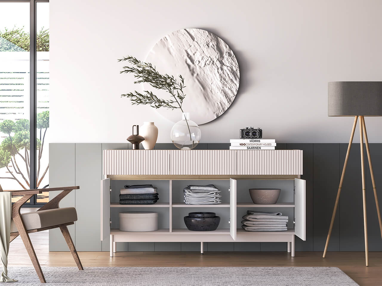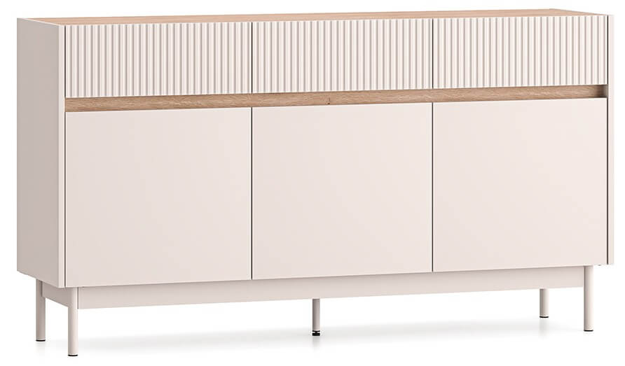 Duża komoda Dunea 05 to idealny mebel do przechowywania. Za potrójnymi drzwiczkami kryje się sześć pojemnych wnęk. Przechowasz w nich ubrania, ręczniki czy zastawę stołową. Górną część mebla tworzą trzy szuflady, idealne na dokumenty lub domowe tekstylia. Szeroki blat będzie idealnym miejscem do wyeksponowania eleganckich wazonów lub pamiątek z podróży. Wybierz komodę Dunea i zachowaj porządek w swoim wnętrzu.