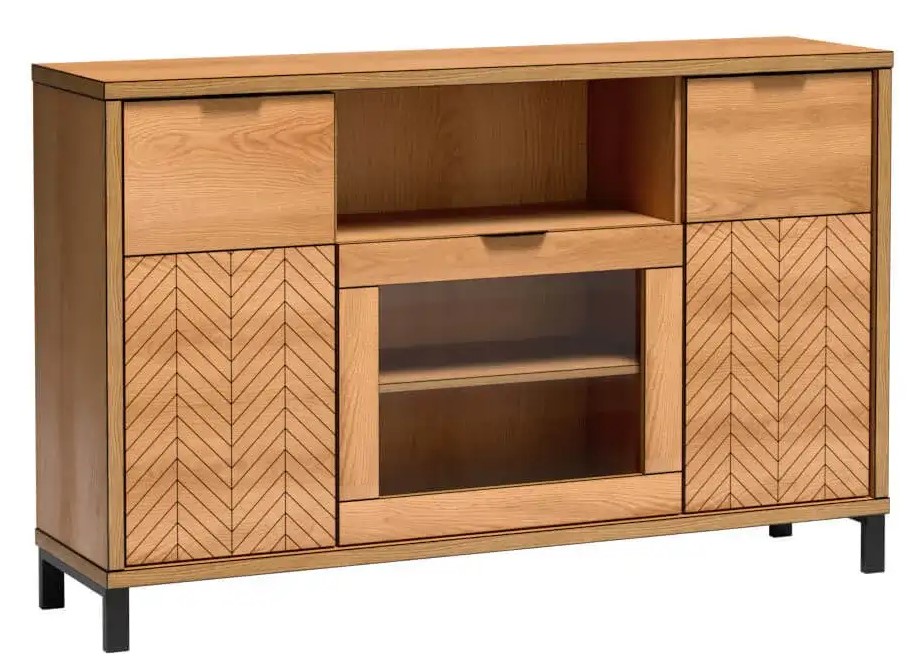 Praktyczna komoda z kolekcji FONTI w kolorze dąb karmel. Po bokach mebla znajdziemy szafki z jedną półką, w których pomieści się wiele rzeczy. Centrum komody wita nas szafką z przeszklonym frontem, w której znajdziemy półkę dzielącą przestrzeń na pół. Nad szafką znajdziemy półkę na różne drobiazgi.